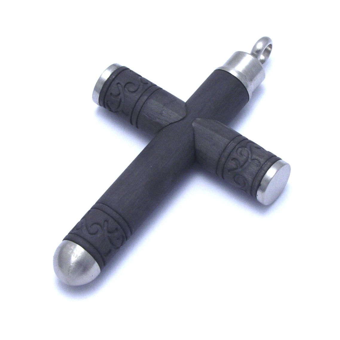 Der attraktive Carbon Kreuz Anhänger stellt genau das richtige Geschenk für einen besonderen Anlass wie zu einem christlichen Fest dar. Der Anhänger besteht aus hochwertigem Edelstahl und wertvollem Carbon, das einen reizvollen Kontrast ergibt. An den beiden Seiten und unten weist das Kreuz auf dem Carbon eine dekorative Verzierung auf. Es hat eine Länge von 58 mm und ist 36 mm breit. Die Stärke beträgt 8 mm. Am besten sieht der edle Anhänger an einer Kette aus, die ebenfalls aus Edelstahl oder aus schwarzem Leder gearbeitet ist, und an einem Silberkettchen.