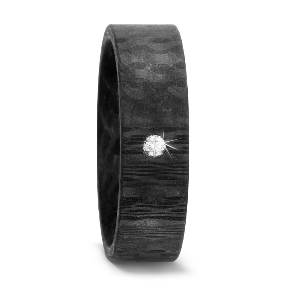Der edle Ring aus Carbon mit einer feinen Maserung auf der Oberfläche brilliert mit einem wertvollen Diamanten mit 0,03 ct w-si. Der feine Fingerschmuck ist 6 Millimeter breit und 2,1 Millimeter stark. Dieser attraktive Carbon Ring ist für den festlichen Anlass genau passend. Er stellt ebenso ein originelles Geschenk dar.