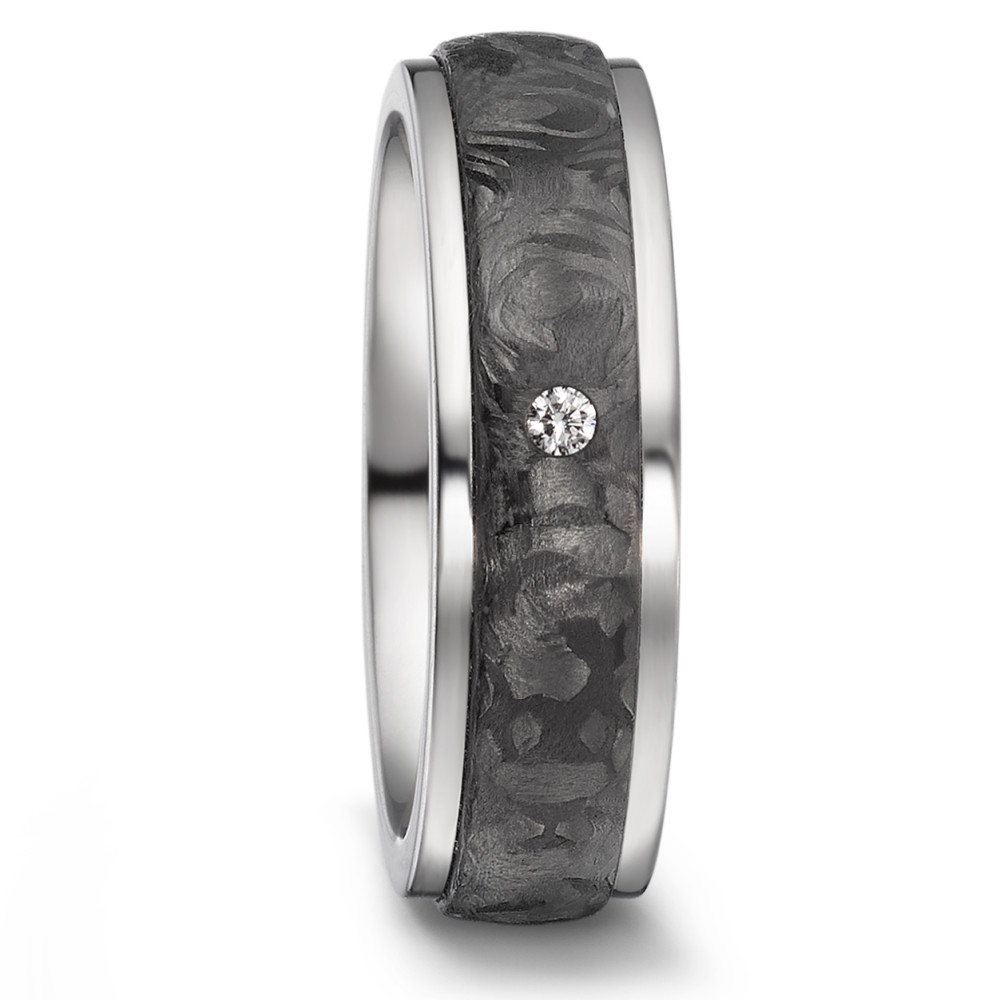 Der hochwertige Titan Carbon Ring wirkt besonders eindrucksvoll durch seine kontrastreiche Zusammenstellung der edlen Materialien. Während das glänzende Titan den äußeren Mantel bildet, liegt das fein gemusterte Carbon in der Mitte auf. Spezielles Highlight bildet der brillant geschliffene Diamant mit 0,03 ct w-si. Der Titan Carbon Ring ist 7 Millimeter breit und 3 Millimeter stark.