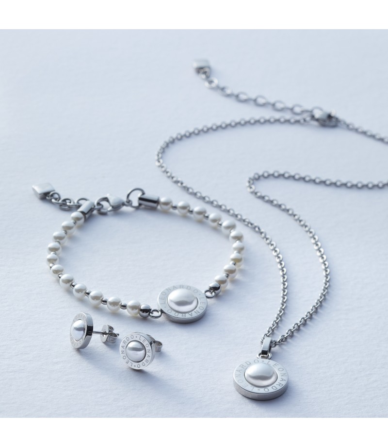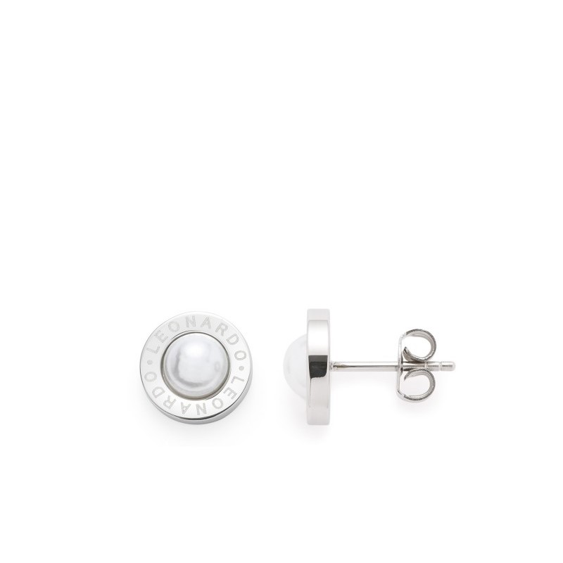 Dezente, aber ausdrucksstarke Ohrstecker. Im kreisrunden Edelstahlplättchen sitzt blickfangreich ein Perlmutt-Cabochon, am Rand der Edelstahlfassung ist der LEONARDO-Schriftzug eingraviert. Perfekt zur passenden Halskette und zum Armband.