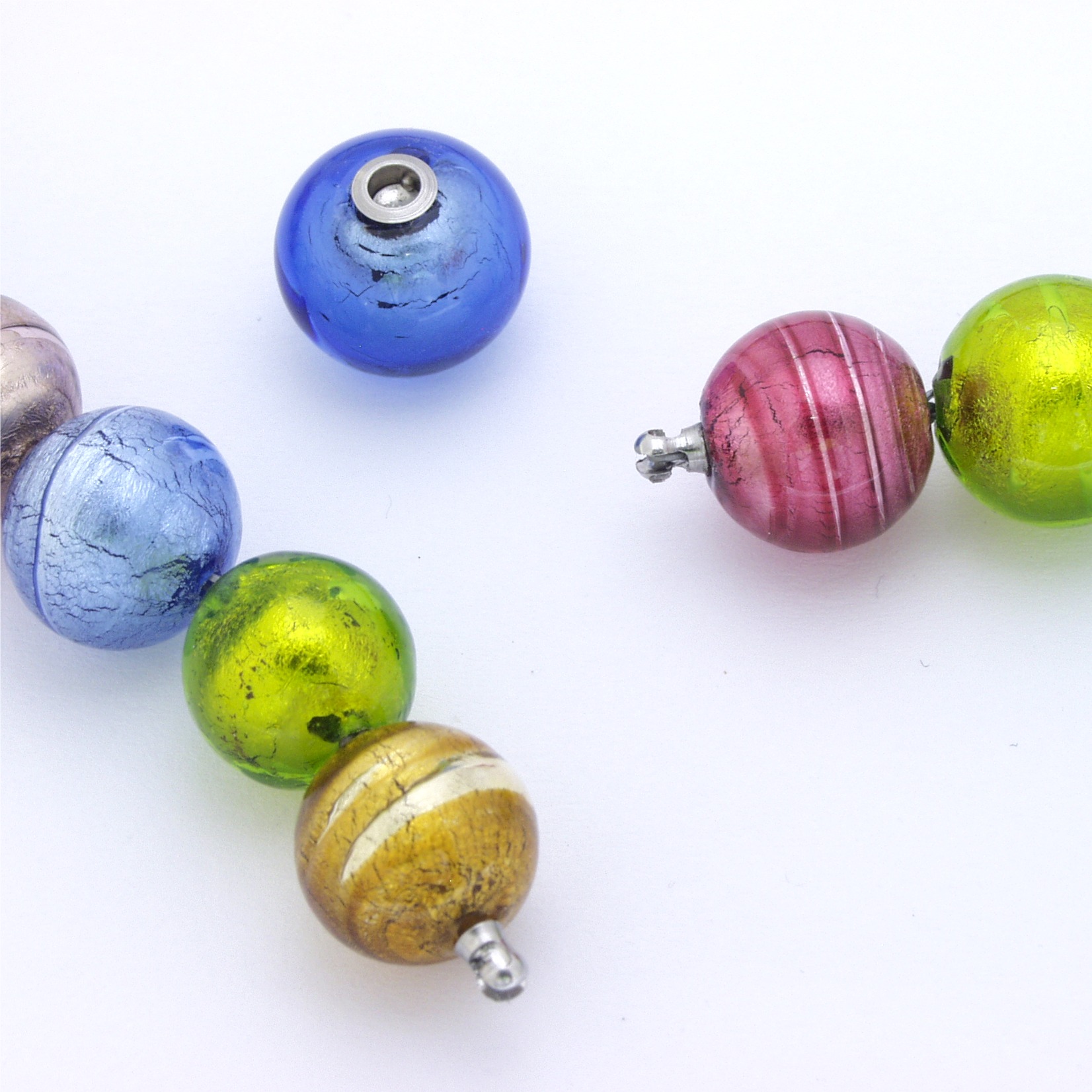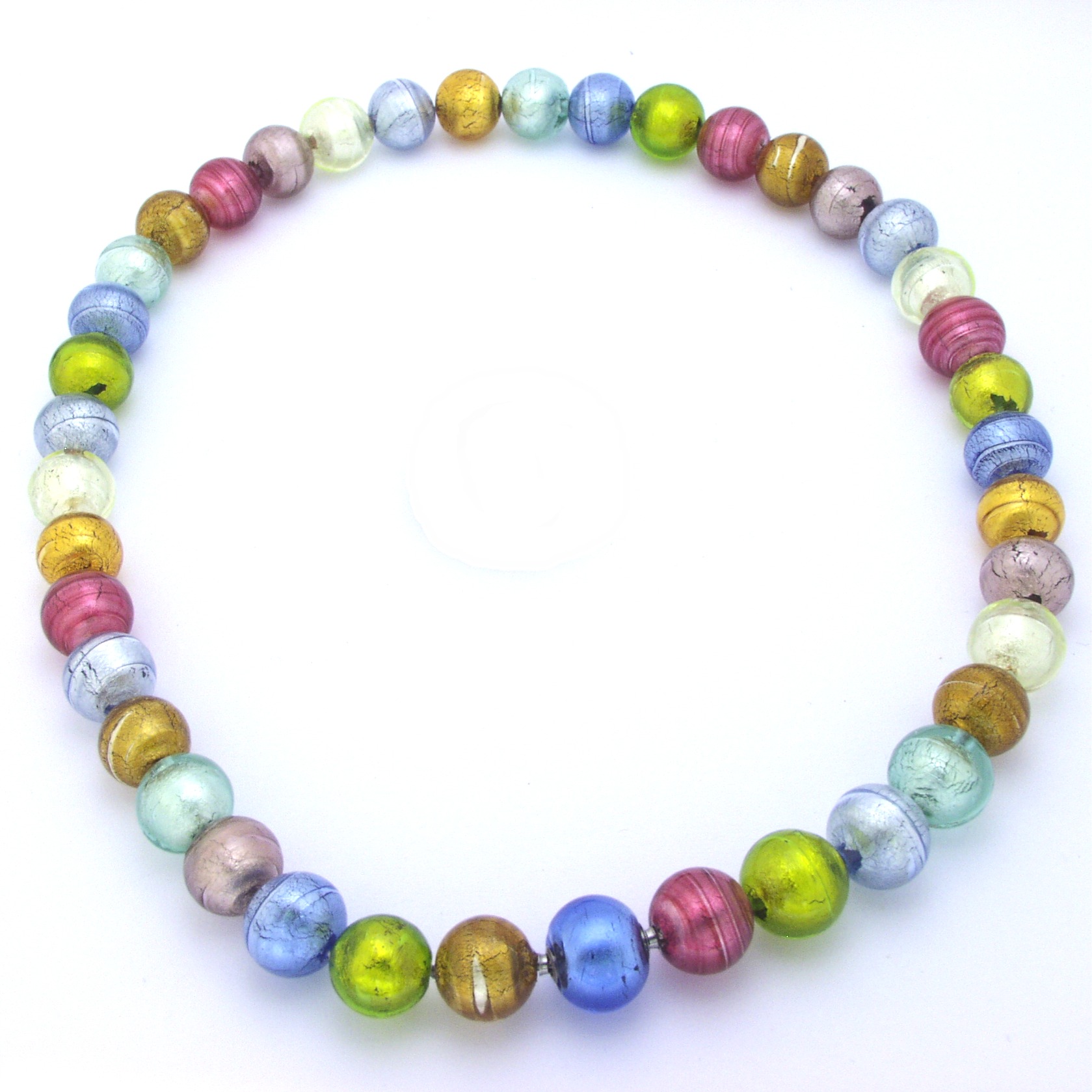 Das wertvolle Casa Blanca Collier mit farbenprächtigen Kugeln aus echtem Murano Glas verfügt über einen Wechselverschluss, der in geschlossenem Zustand an der Kette nicht zu erkennen ist. In die bunten Murano Perlen wurde jeweils feines Blatt Platin eingearbeitet, welches durch das edle Glas schimmert und dem Halsschmuck einen individuellen Touch verleiht. Der Wechselverschluss an dem Collier kann ausgetauscht werden. Die hübsche Kette hat ein Gewicht von 92 Gramm, ist 46 cm lang und 12 bis 13 mm breit.