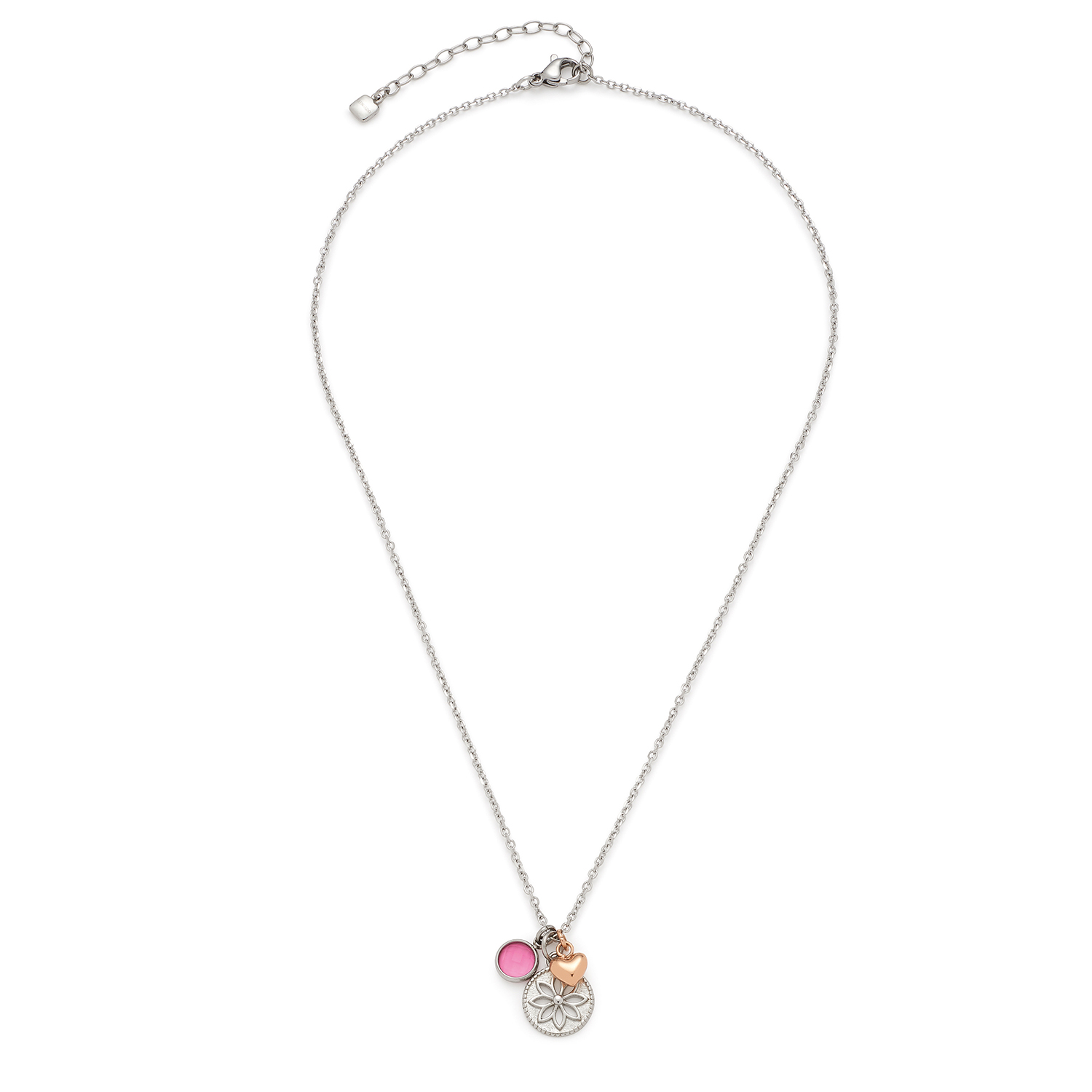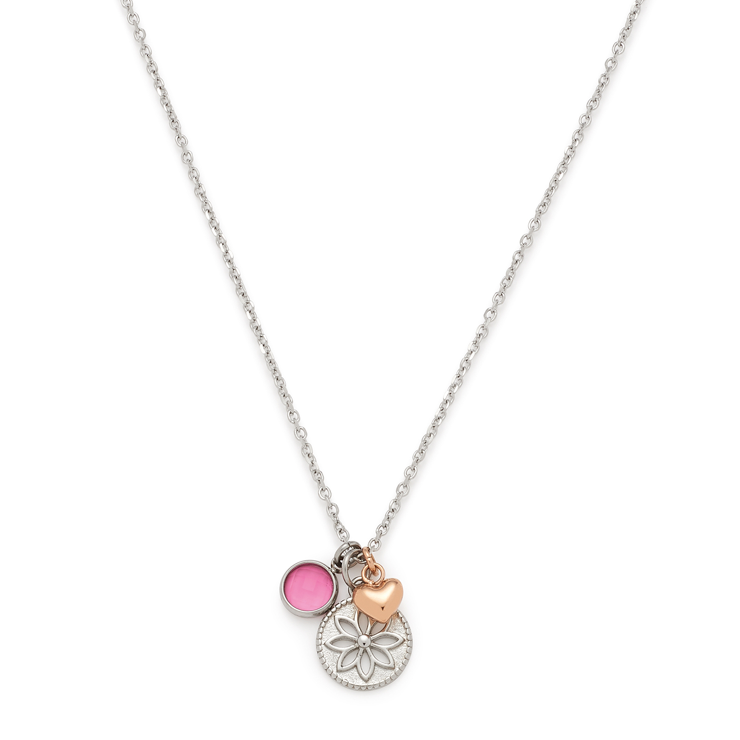 Dieses feine Ankerkettchens aus diamantiertem Edelstahl besitzt ein stimmungsvolles Anhänger-Dekor und erzeugt mit silberfarbenem Blütenmotiv, roségoldfarben ionenplattiertem Miniatur-Herzchen und leuchtendem Glasstein eine positive Ausstrahlung.