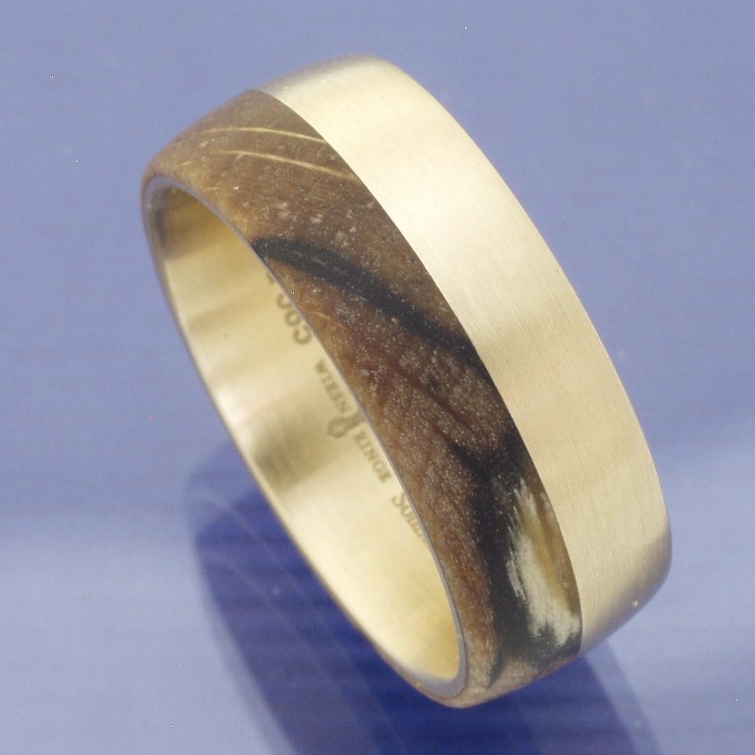 Ring aus 585 Apricotgold, in Handarbeit angefertigt. Der Ring wird mit Holz (gestockte Buche) veredelt. Individualität ist bei diesen Ringen handgemacht. Kein Schmuckstück gleicht exact dem anderen.