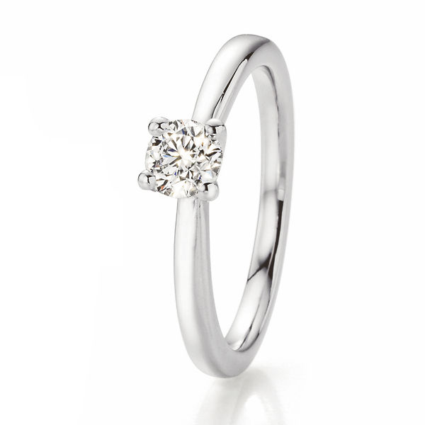 Solitaire Ring aus 585 Weissgold mit einem 0,400 ct w/si Brillant. Aus der Serie "Herz über Kopf" Fassung: Krappenfassung Ringschiene: Breite: 2,1 mm Stärke 2 mm