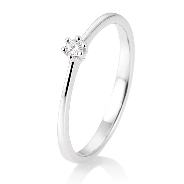 Dieser Solitaire Ring aus 585 Weissgold ist der perfekte Antragsring oder Verlobungsring für Ihre zukünftige Braut. Der Ring ist mit einem wunderschönen 0,05 ct Brillanten besetzt, der in der hochwertigen si-Qualität strahlt. Die schlichte Eleganz des Rings lässt den funkelnden Diamanten besonders zur Geltung kommen und macht ihn zum idealen Begleiter für den schönsten Moment im Leben eines Paares. Mit diesem Solitaire Ring aus 585 Weissgold geben Sie Ihrer Liebe einen wahrhaft kostbaren Ausdruck.