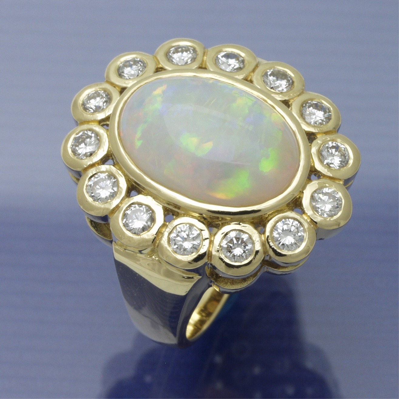 Dieser Ring wird aus 750 Gelbgold in unserer Werkstatt für Sie hergestellt und mit 0,85 ct TW-si Brillanten und einem 4,33 ct Opal gefasst. Breite: 3,6 - 23 mm Stärke: 1,3 - 8,5 mm mm Gewicht ck 14 Gramm