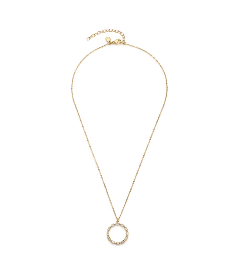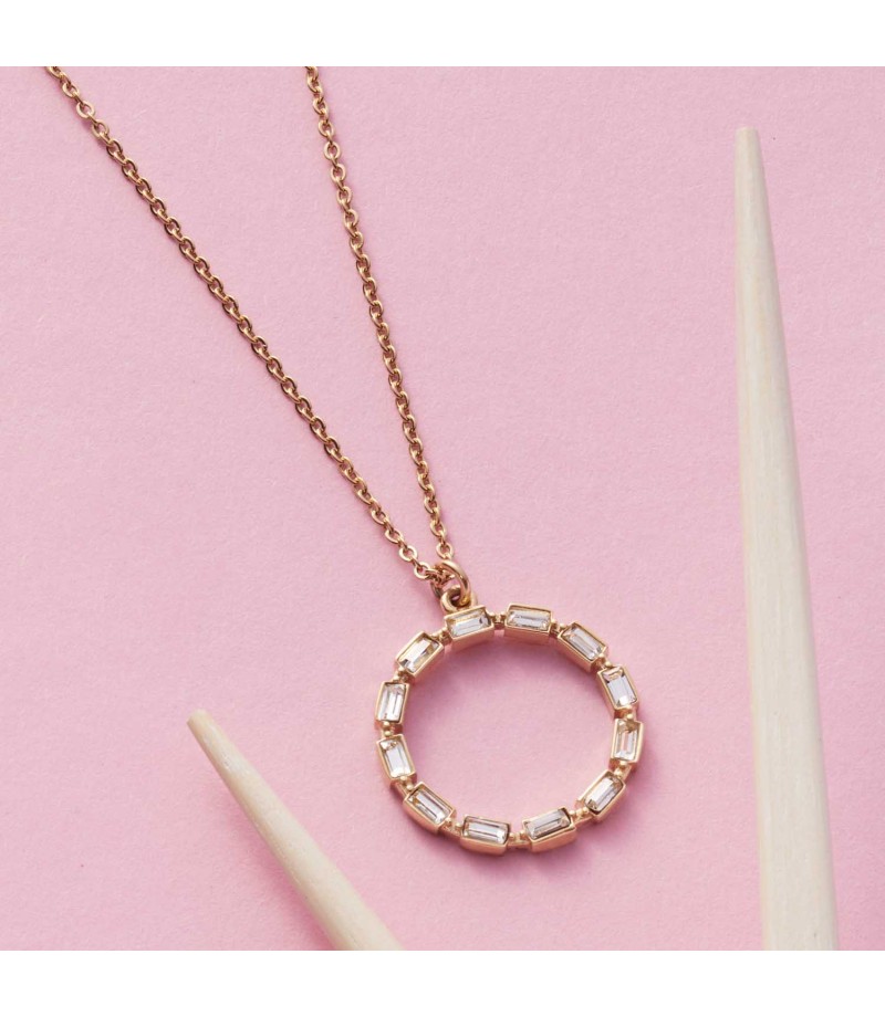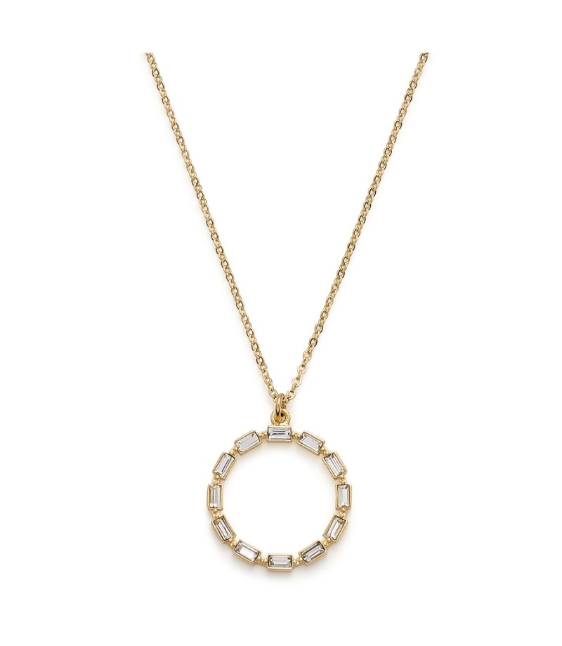 Der geschlossene Kreis als Symbol der Unendlichkeit macht diese filigrane Halskette aus.Ein zartes Ankerkettchen mit einem Karabinerverschluss und Verlängerung trägt den runden Anhänger, der seine Form durch aneinander gereihte, klare und facettierte Baguette-Kristalle erhält.