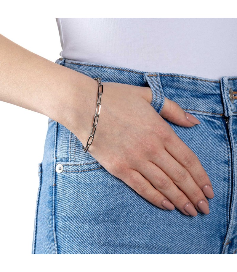 Ganz schlicht und puristisch als Ergänzung zur Lederjacke, oder doch lieber verspielt mit eingeclipten Chains und individuellen Anhängern? Das schlichte Armband aus rechteckigen Kettengliedern plus Mini-Clips kann auch zur Verlängerung der Halskette dieser Serie benutzt werden.