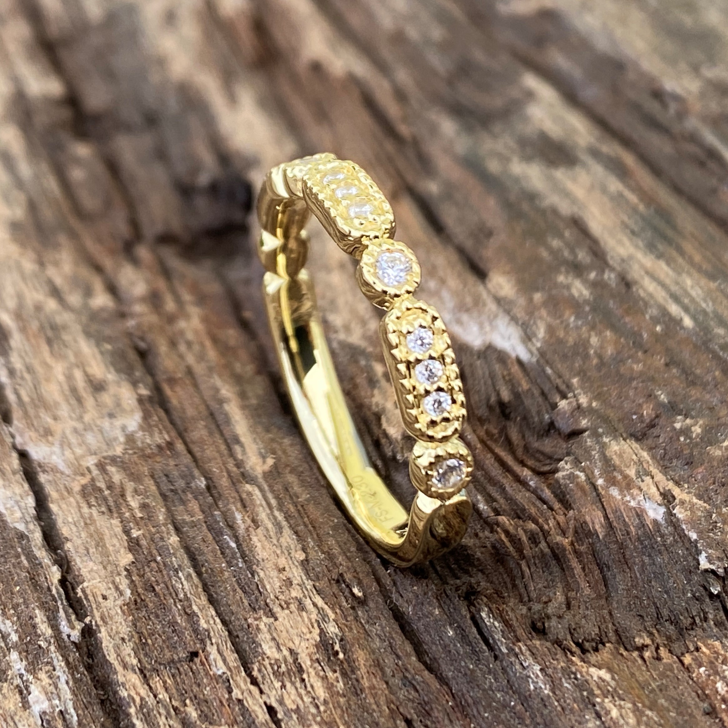 Dieser Ring wird aus 585 Apricotgold angefertigt und mit 0,143 ct Brillanten gefasst. Der außergewöhnliche Diamantring, inspiriert durch den südasiatischen Stil, besitzt eine besondere Anziehungskraft. Die originelle Ringschiene mit ihren unterschiedlich großen, funkelnden Brillanten und dem feinen Millgriff ist ein wahrer Hingucker.