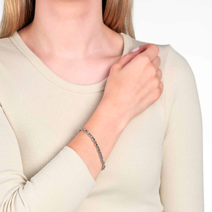 Das Edelstahl-Armband, wahlweise mit einer goldenen Ionen-Plattierung, erweist sich als eindrucksvolles Accessoire, das am Handgelenk als dekorativer Solist strahlt. Gleichzeitig bietet es die Möglichkeit, das passende Collier auf stilvolle Weise zu verlängern und in eine etwas längere Halskette zu verwandeln.