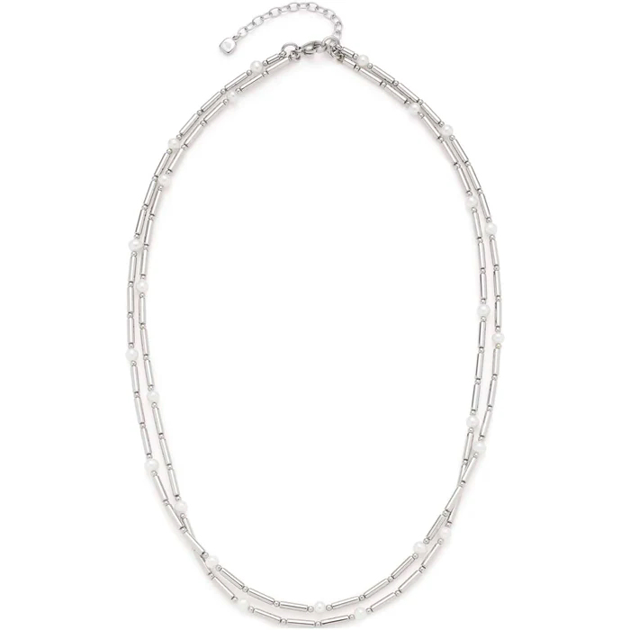 Lassen Sie sich von der faszinierenden Kombination aus Geradlinigkeit und weichen Kurven verzaubern: Dieses kurze Collier vereint geschickt aneinandergereihte Edelstahl-Stäbchen, zarte Süßwasser-Zuchtperlen und Mini-Edelstahl-Kügelchen zu einem wahrlich unkonventionellen Schmuckstück, das moderne Looks perfekt ergänzt.