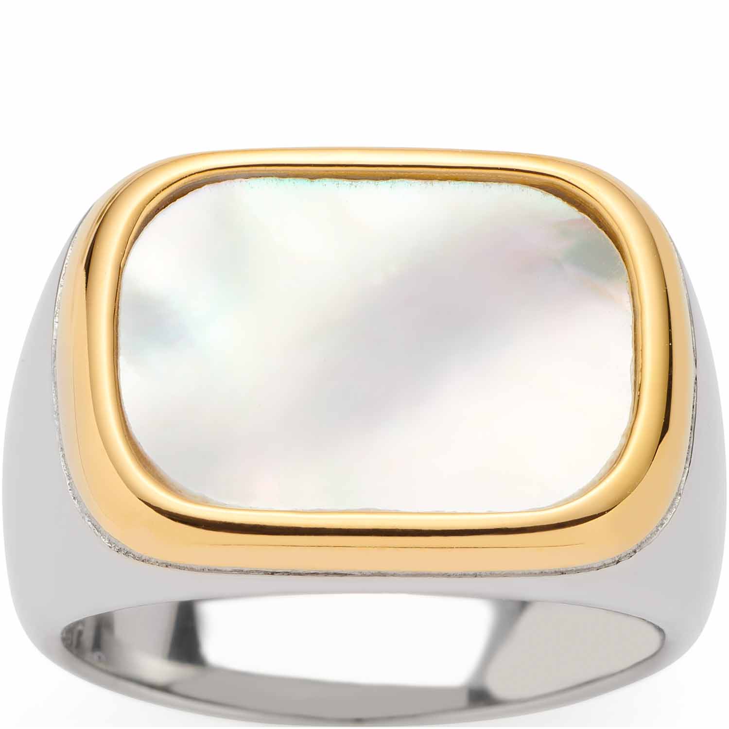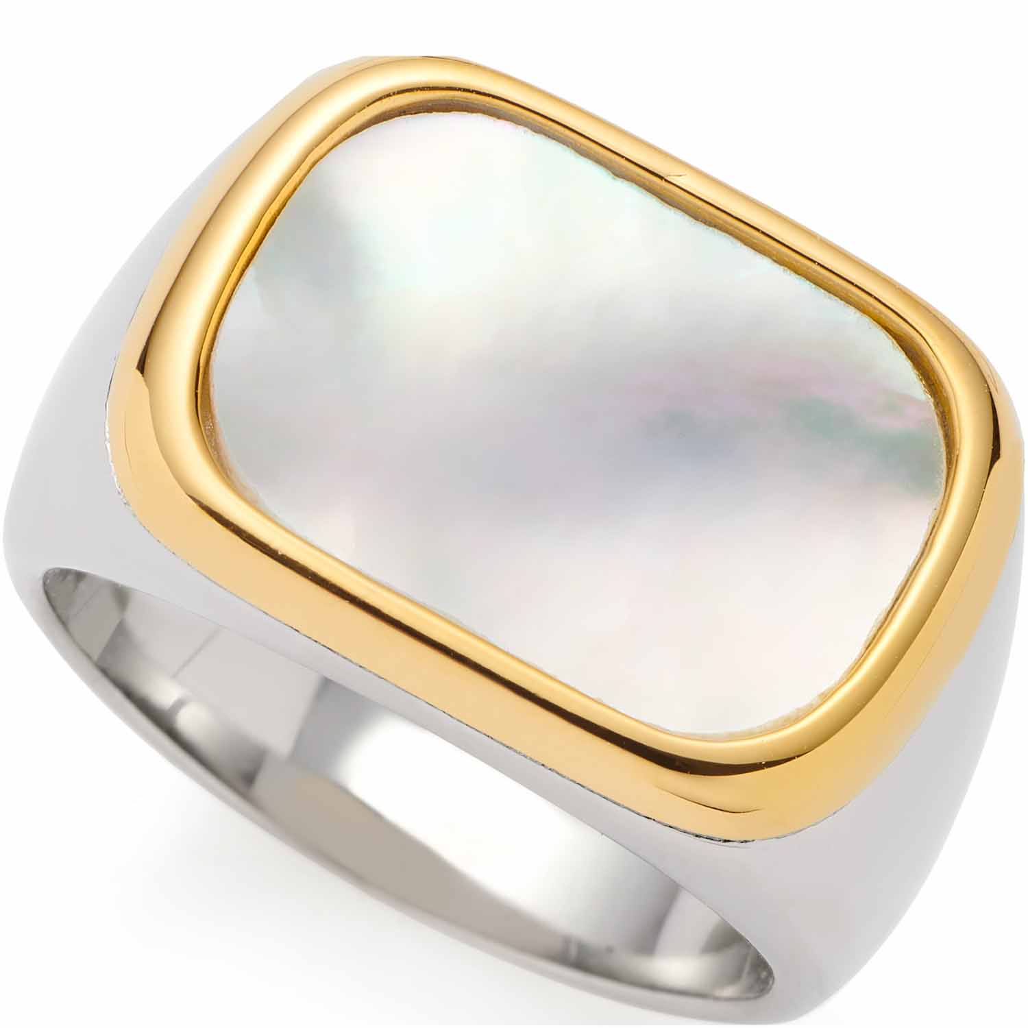 Der Ring greift das angesagte Bicolor-Thema der passenden Halskette und Ohrstecker auf und präsentiert sich in einem kunstvoll gestalteten, stark abgerundeten Rechteckformat. Der Kontrast zwischen dem golden ionenplattierten Rand und der innen ausgelegten, schimmernden weißen Perlmuttfläche schafft eine beeindruckende Optik, die alle Blicke auf sich zieht.