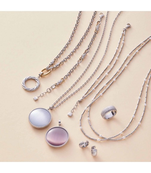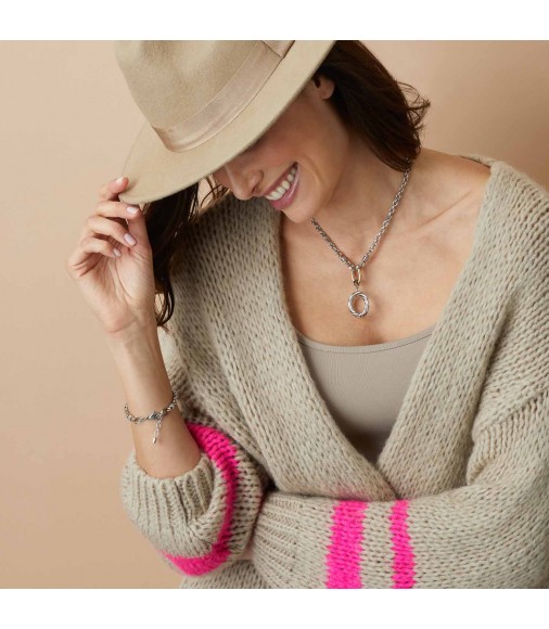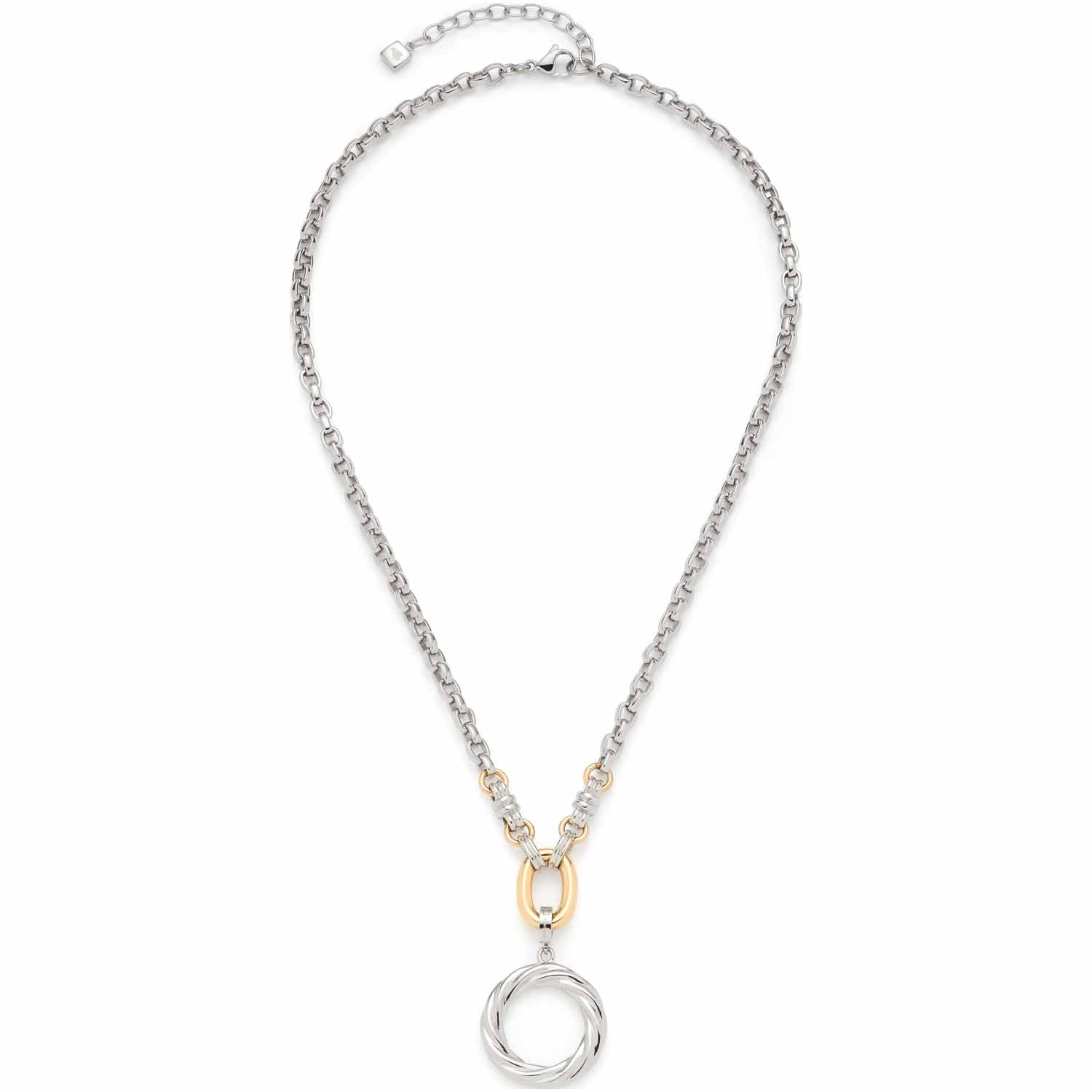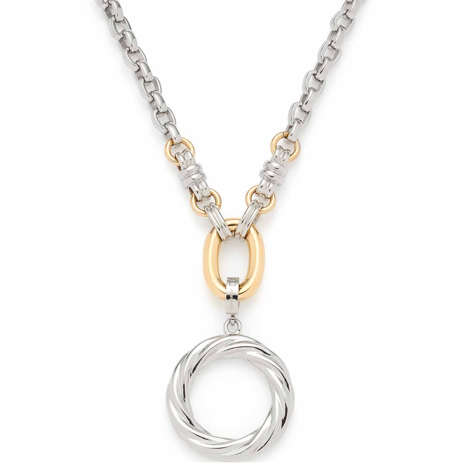Diese Halskette wird zum wahren Eyecatcher durch die Bicolor-Elemente, bestehend aus dekorativen Ösen und einem ovalen Ring. In der Mitte des Rings befindet sich ein kreisrunder Anhänger, der in der Optik einer insich gedrehten Kordel gestaltet ist - ein wahrlich faszinierender Akzent.