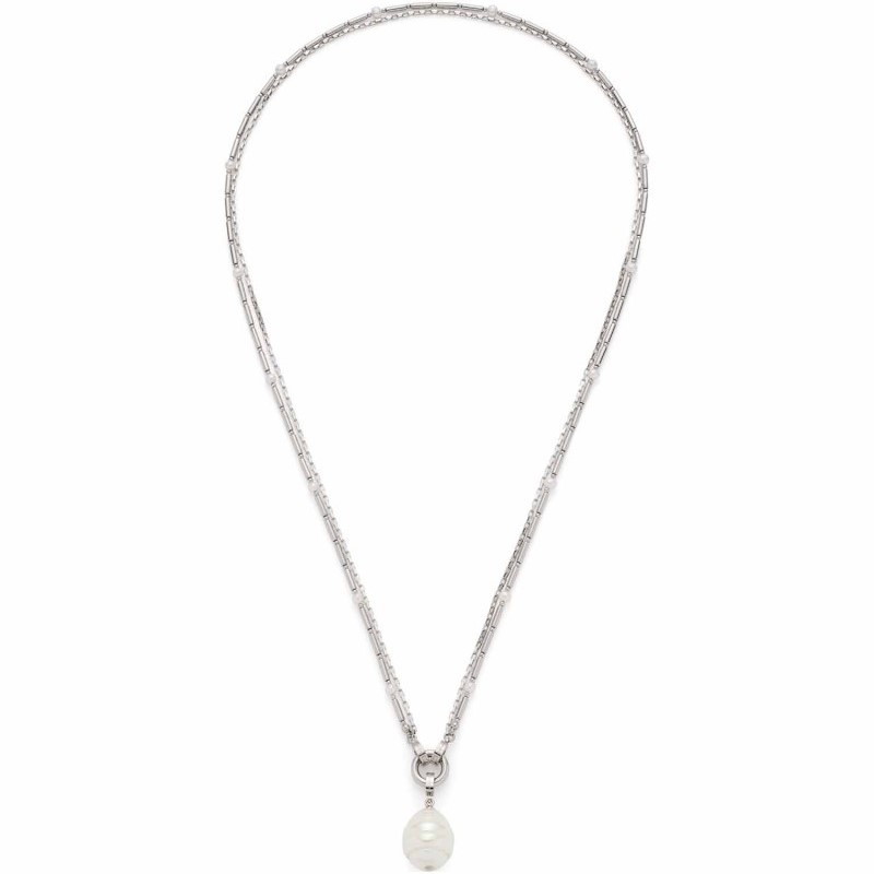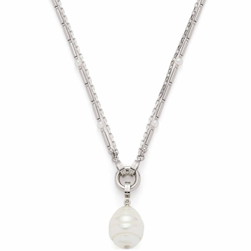 Die Halskette ist geprägt durch zwei unterschiedliche, jedoch harmonisch aufeinander abgestimmte Reihen. Die erste Reihe zeichnet sich durch aufgereihte Edelstahl-Stäbchen, anmutige kleine Süßwasser-Zuchtperlen und zierliche Edelstahl-Kügelchen aus. Die zweite Reihe ist eine feine Ankerkette, gefertigt aus hochglanzpoliertem Edelstahl, der einen schönen Glanz und Langlebigkeit garantiert.