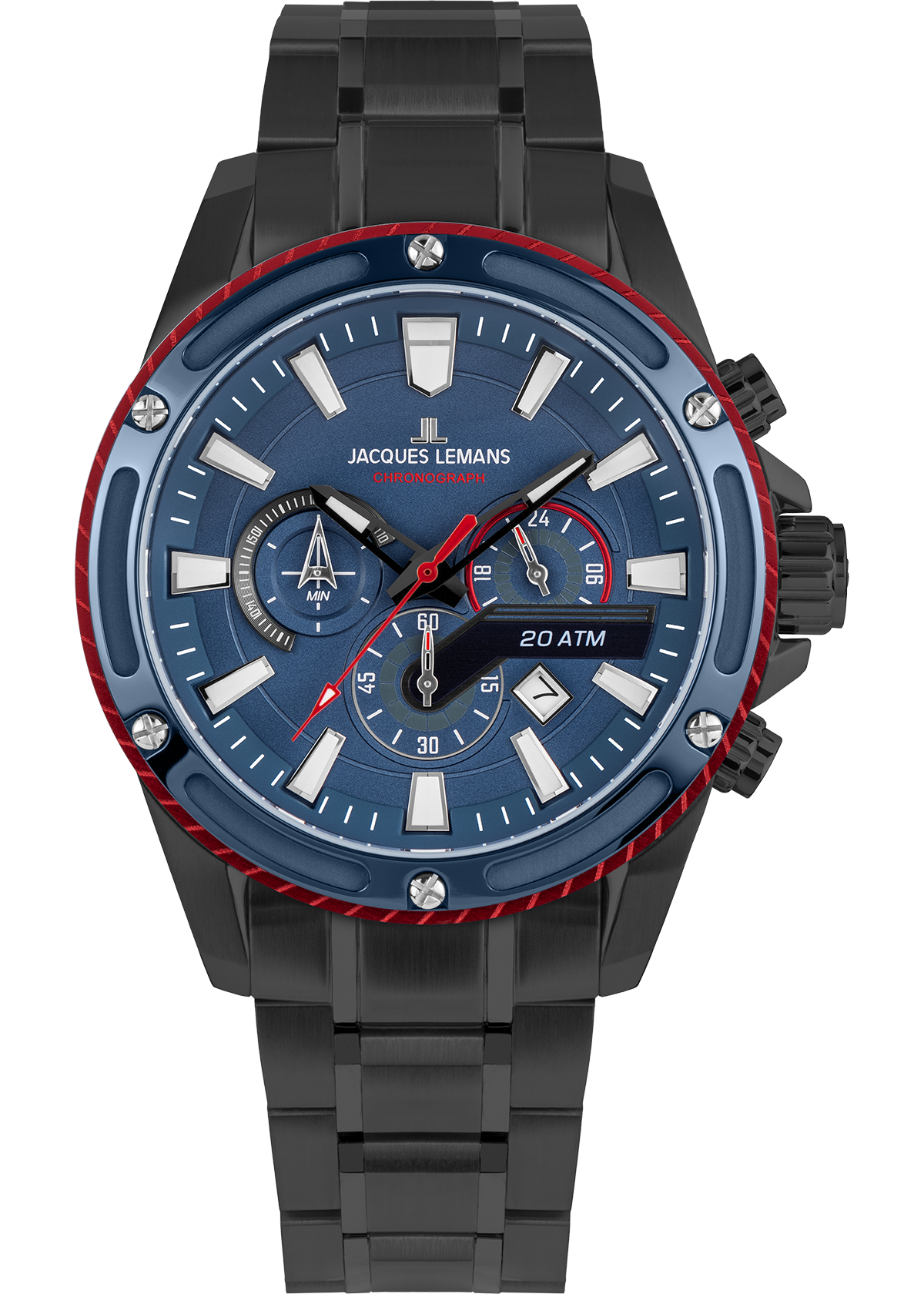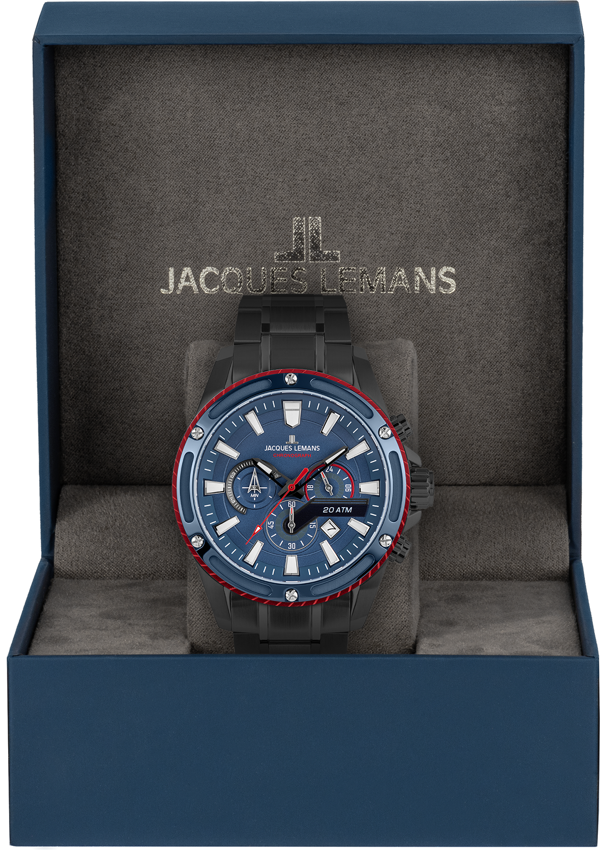 Diese moderne Herrenuhr von Jacques Lemans fasziniert mit ihrem sportlich-dynamischen Design. Das tiefe Blau des Zifferblatts kontrastiert gekonnt mit roten Akzenten, die für ein lebendiges und auffälliges Erscheinungsbild sorgen. Die Chronographenfunktion wird durch verschiedene kleinere Zifferblätter dargestellt, welche für eine zusätzliche Ebene der Komplexität und Funktionalität stehen. Große, gut ablesbare Zeiger und Indexe verstärken die maskuline Ästhetik. Ein markanter roter Ring hebt die Lünette hervor und harmoniert mit dem dunklen Farbton des Gehäuses. Das robuste schwarze Armband aus hochwertigem Material verspricht nicht nur Tragekomfort, sondern auch Langlebigkeit. Diese Uhr ist ein echtes Statement-Piece, das sowohl im Alltag als auch bei besonderen Anlässen getragen werden kann.