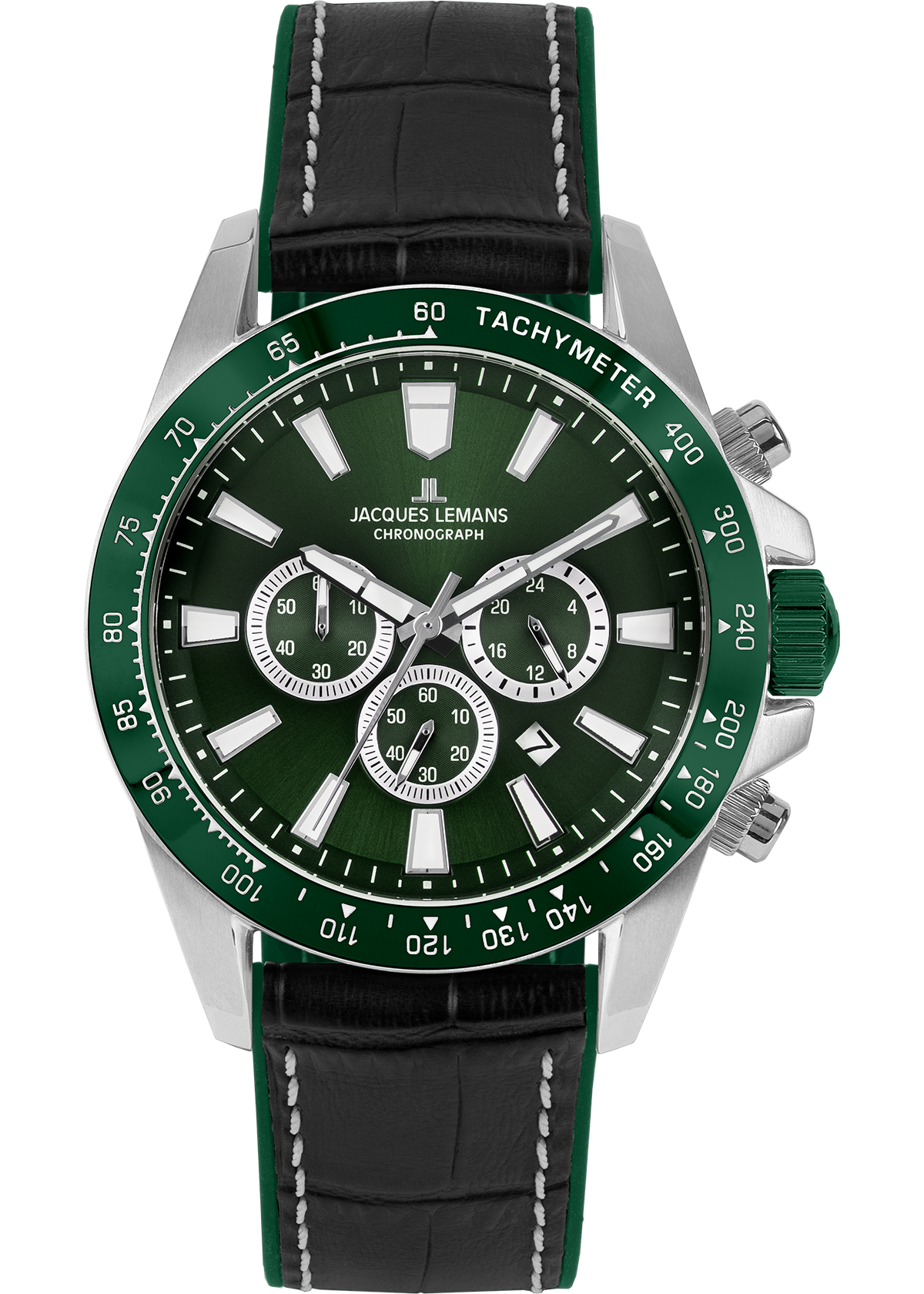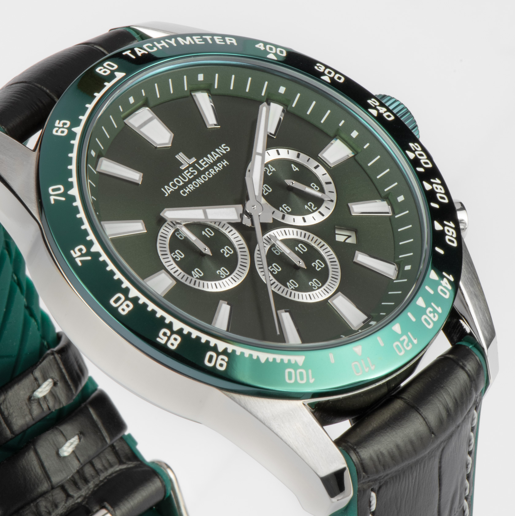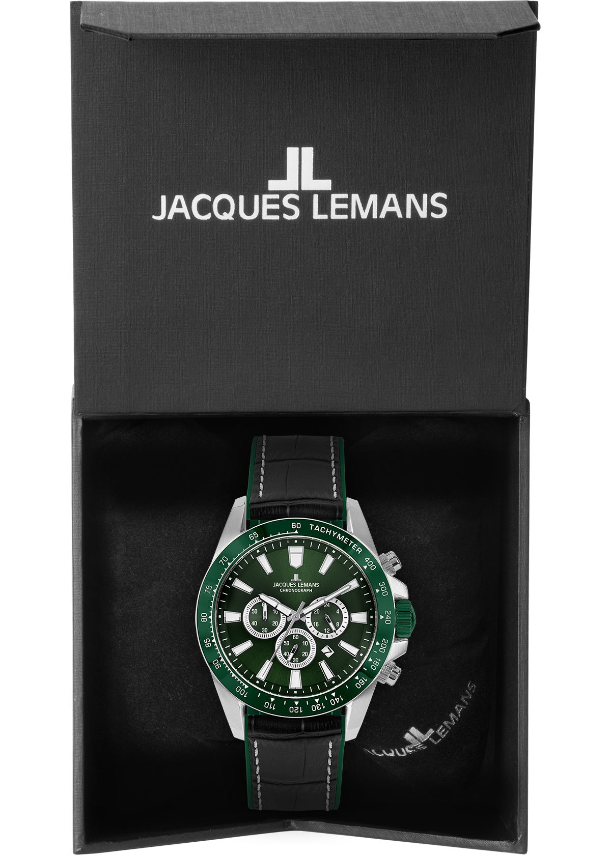 Diese elegante Jacques Lemans Herrenuhr verbindet Funktionalität mit Stil. Mit einem robusten Gehäuse und einem auffälligen grünen Zifferblatt, das mit einer Tachymeterskala versehen ist, ist sie der perfekte Begleiter für den modernen Mann. Die Uhr verfügt über praktische Chronographenfunktionen, untergebracht in drei kleineren Zifferblättern, die eine präzise Zeitmessung ermöglichen. Leuchtende Zeiger und Stundenmarkierungen sorgen für optimale Ablesbarkeit zu jeder Tageszeit. Abgerundet wird das Design durch ein klassisches schwarzes Lederarmband, das einen Hauch von Eleganz hinzufügt und den Tragekomfort erhöht. Diese Uhr ist nicht nur ein Zeitmesser, sondern auch ein Statement am Handgelenk.