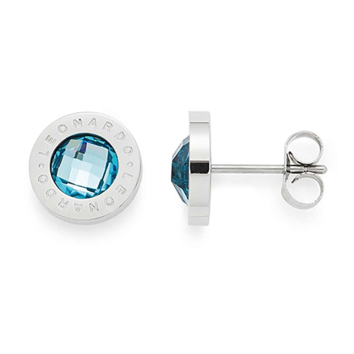 Kleine Ohrstecker aus Edelstahl, die in ihrer Mitte einen geschliffenen hellblauen Glaskristall halten der sie noch mehr funkeln lässt.
