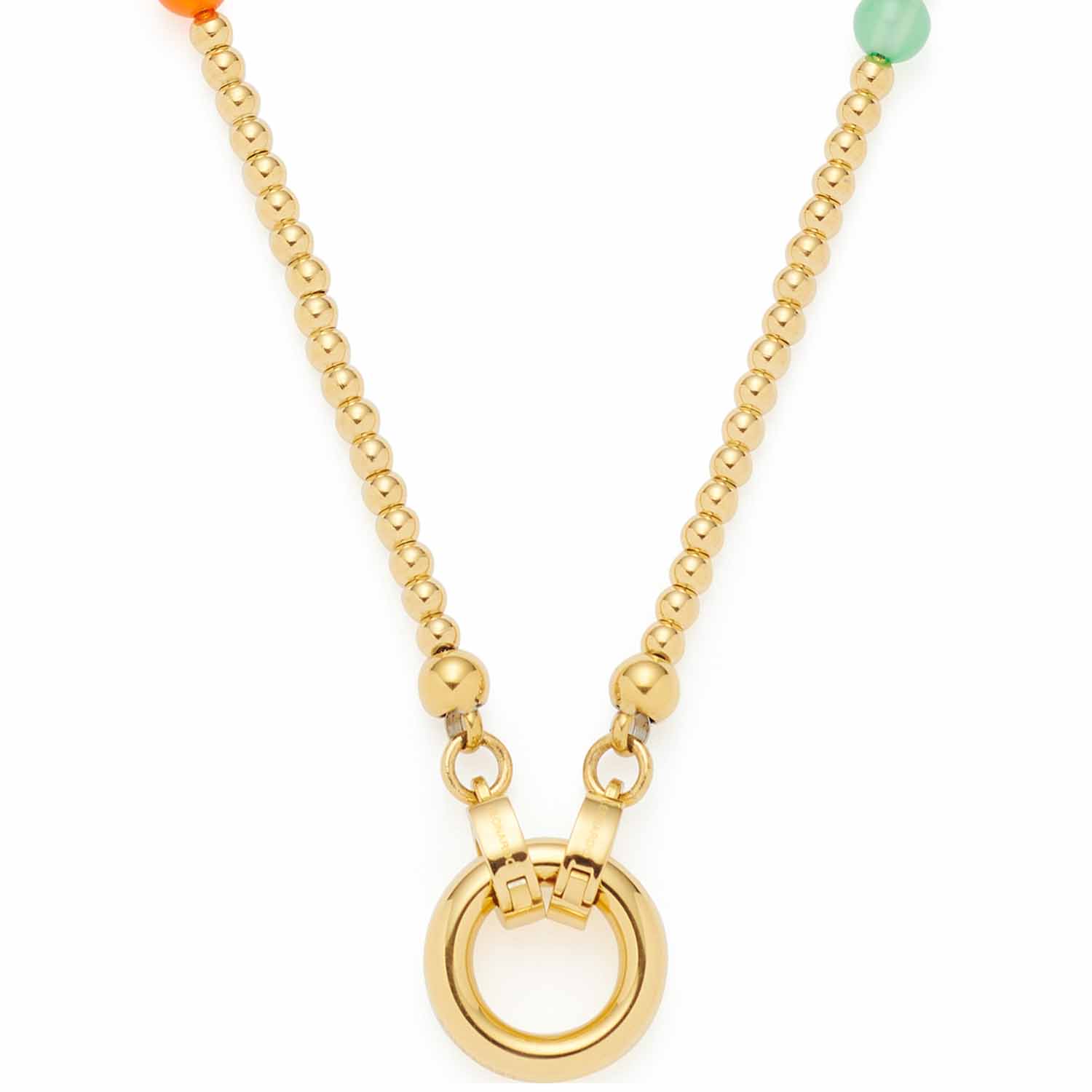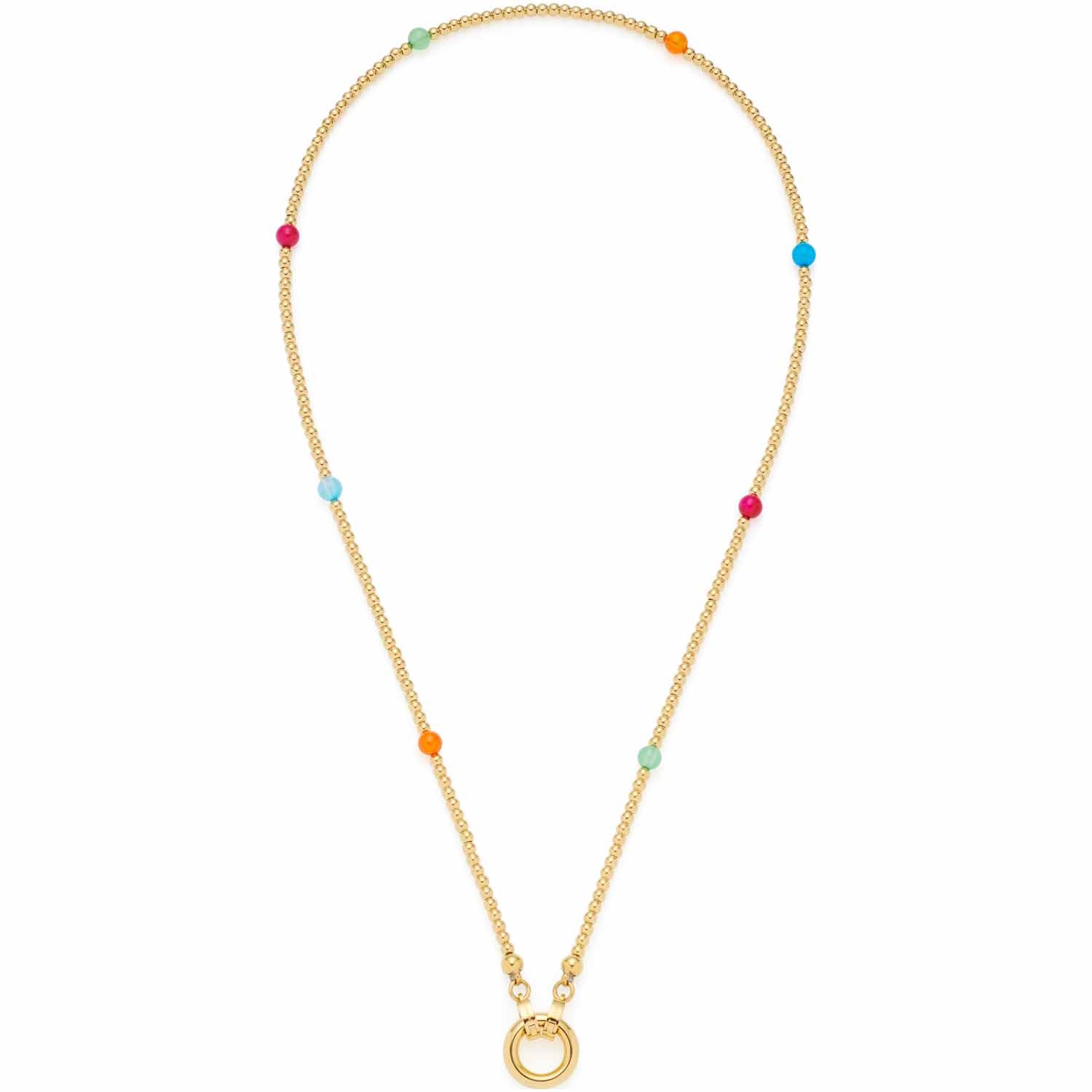 Tauchen Sie ein in die Welt der Farben und des Luxus mit unserer kurzen Perlenkette, die Eleganz und Individualität vereint. Diese Kette besteht aus aneinandergereihten Edelstahl-Kügelchen, die durch bunte, durchgefärbte Achat-Perlen veredelt werden. Die goldene Ionenplattierung verleiht dieser Kette eine zusätzliche Dimension, indem sie die Farben besonders strahlen lässt.