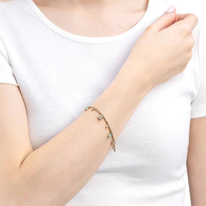 Die Mini-Charms, die in das Armband eingehängt sind, sorgen für eine verspielte Note. Sie bestehen aus kleinen Plättchen mit Edelstahl-Tröpfchen, facettierten Glaskristallen in geschlossener Fassung - sowohl in farblos als auch in zartem Gelb - und aqua-farbenen Glaskristallen, die in offenen Rahmen eingesetzt sind. Diese vielfältige Mischung von Charms verleiht dem Armband einen einzigartigen und eleganten Look.