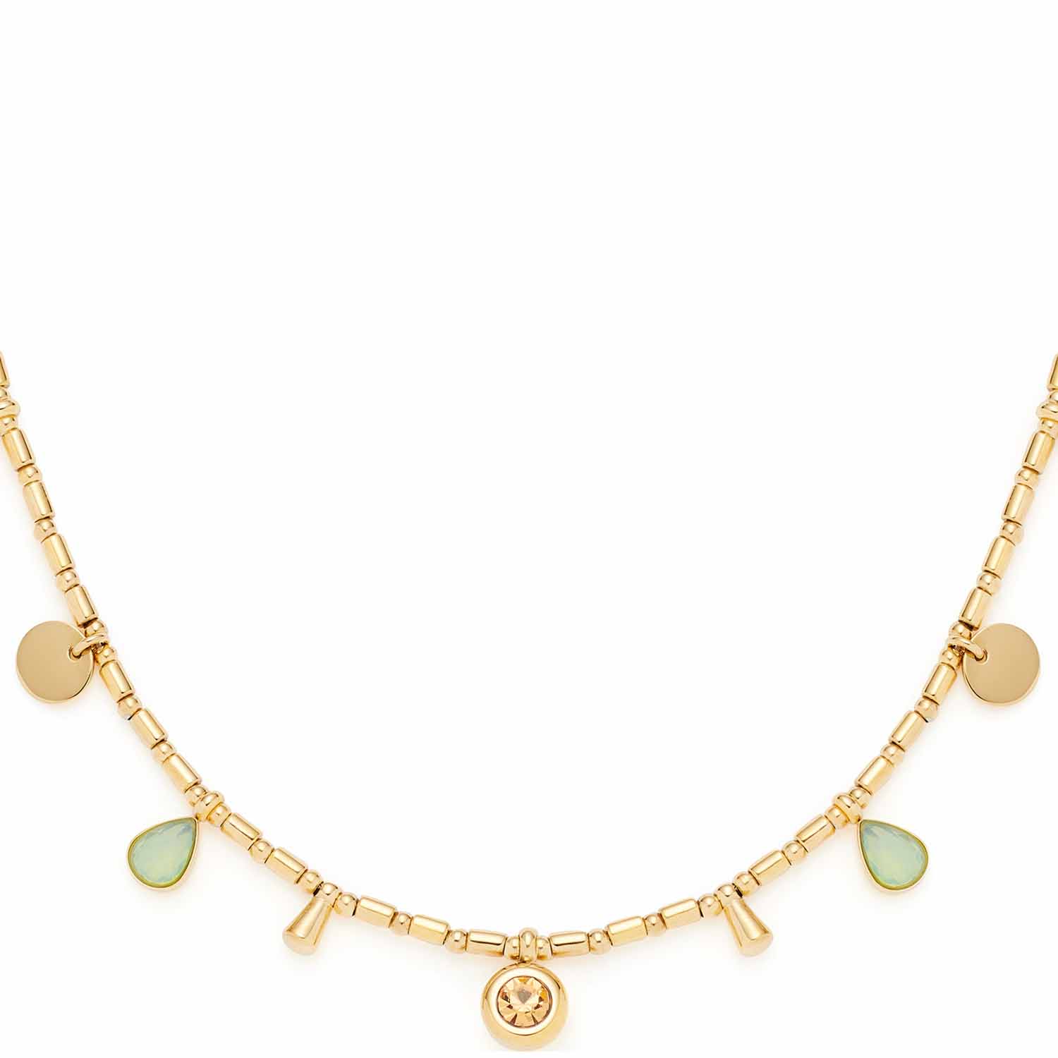 Dieses kurze Collier strahlt einen bezaubernden Charme aus, der jedem Outfit eine verspielte Note verleiht. Die Halskette besteht aus kleinen, aufgereihten Zylinderperlen und winzigen Kügelchen, die aus Edelstahl mit goldener Ionenplattierung gefertigt sind. Ein Hauch von Luxus, der durch die eingehangenen Mini-Charms noch verstärkt wird.