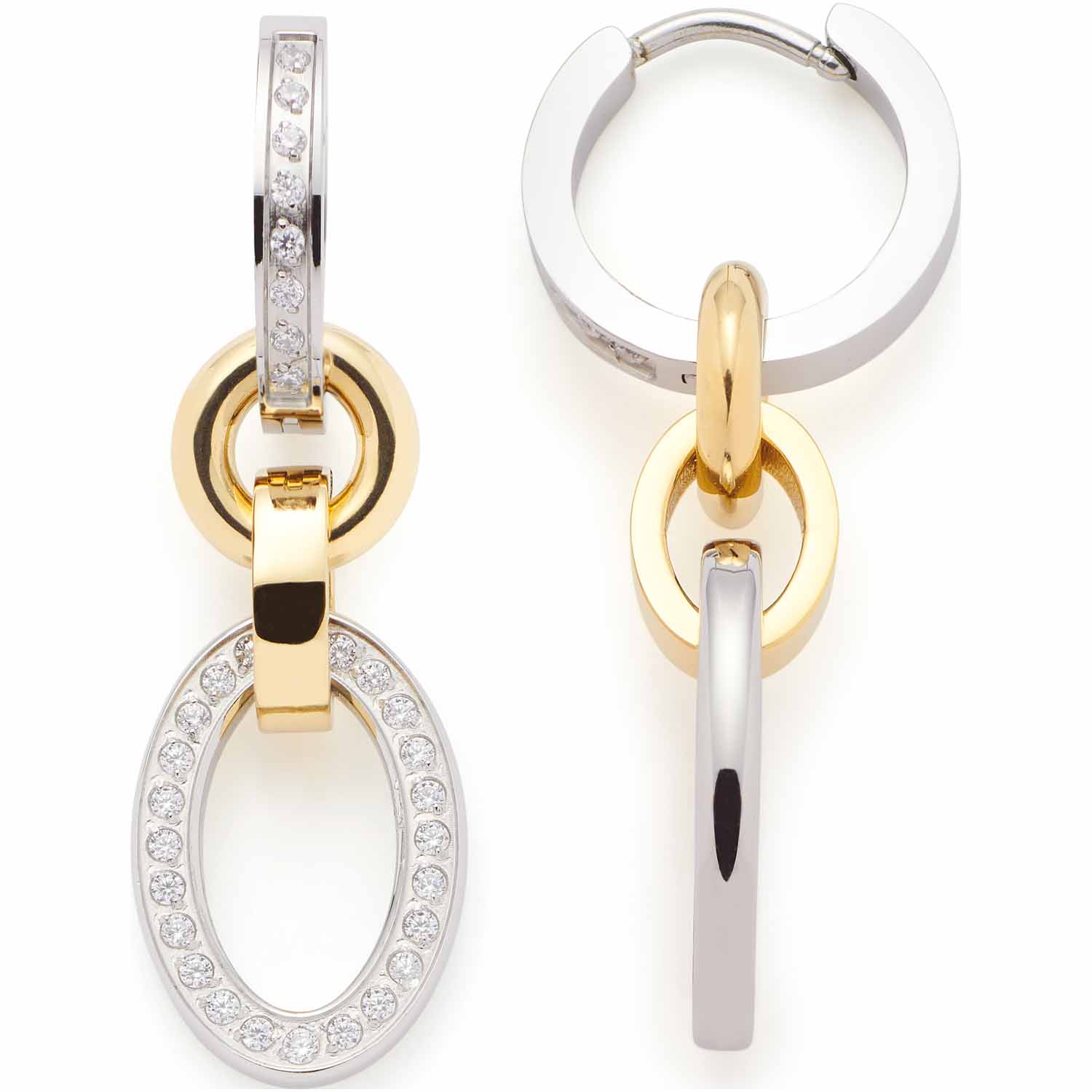 Diese Creolen im aktuellen Chunky-Design sind ein Statement-Schmuckstück, das Ihrem Look Eindruck verleiht. Die kleinen Klappcreolen sind vorderseitig mit funkelnden facettierten Zirkonia-Steinchen besetzt, die bei jedem Lichtstrahl glänzen. Doch das Besondere an diesen Creolen sind die zwei ineinander gesetzten Kettenglied-Elemente, die in die Creolen eingehängt sind und ihnen ihr modisches Bicolor-Design verleihen.