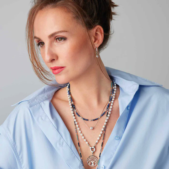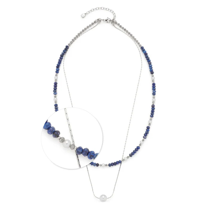 Die erste, halsnahe Kette besticht durch ihren eleganten Mix aus Sodalith-Perlen, die harmonisch mit kleinen Glas- und Imitationsperlen kombiniert sind. Kleine, polierte Stahlkügelchen setzen dabei edle Akzente und verleihen der Kette eine moderne Note.