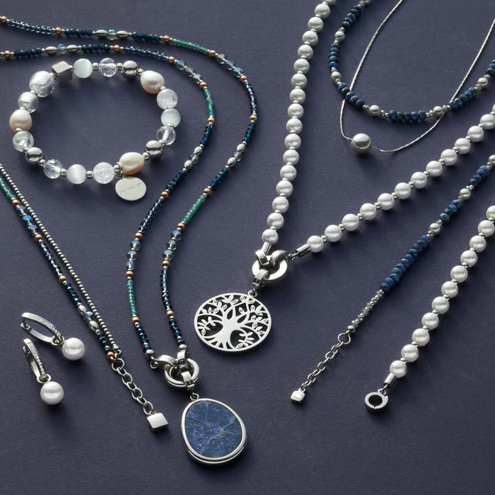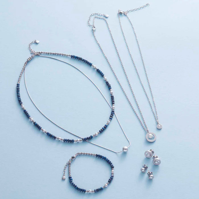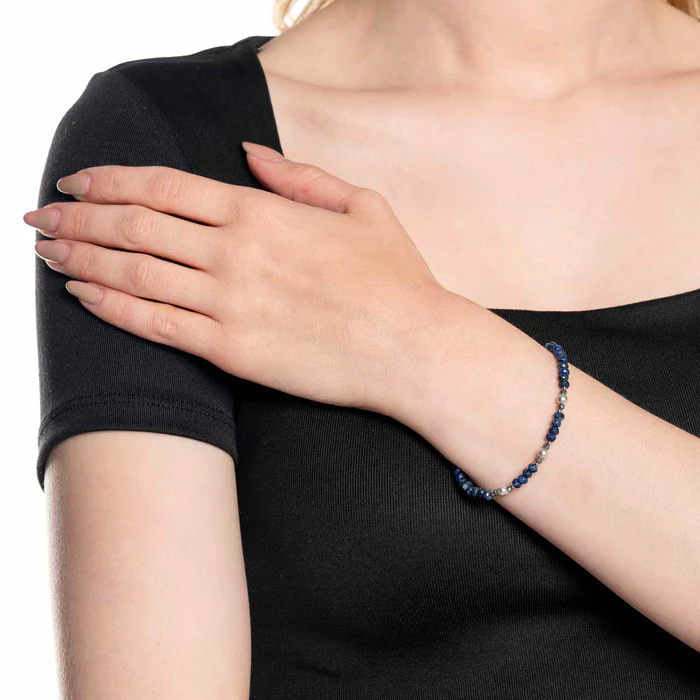 Das Armband ANJANA ist die perfekte Ergänzung zur gleichnamigen Halskette und ein stilvolles Accessoire für jeden Anlass. Es besteht aus einer harmonischen Komposition von gereihten Sodalith-, Glas- und Imitationsperlen, die durch kleine, polierte Stahlkügelchen akzentuiert werden. Diese sorgfältig ausgewählten Materialien verleihen dem Armband eine feine Optik, die sich mühelos in eine Vielzahl von Looks einfügt.