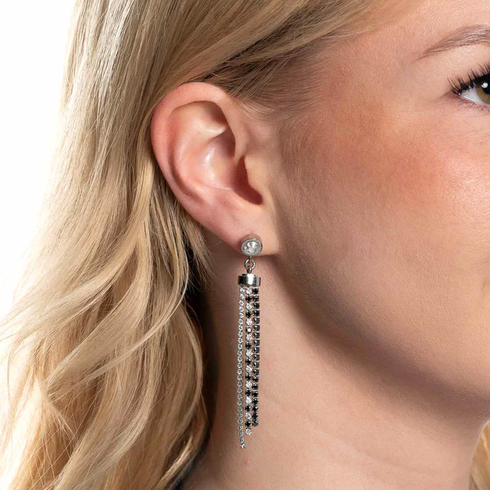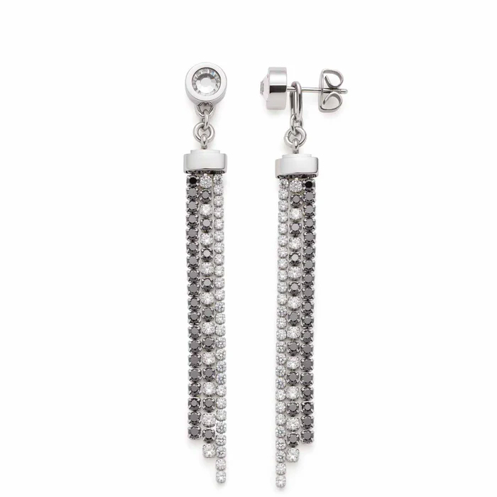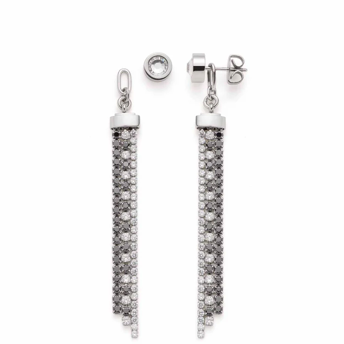 Der schlichte Ohrstecker überzeugt durch einen strahlend weißen Solitär, der auch solo getragen für einen eleganten Look sorgt. Mit der aufsteckbaren Verlängerung verwandelt sich dieser Ohrstecker im Handumdrehen in ein funkelndes Accessoire, perfekt für besondere Anlässe oder den glamourösen Abend. Die Verlängerung, die einfach auf den Stift geschoben wird, besteht aus drei beweglichen Strängen, die mit funkelnden weißen und schwarzen Zirkonia-Steinen besetzt sind. Diese sorgen für einen faszinierenden Glanz und setzen raffinierte Akzente.