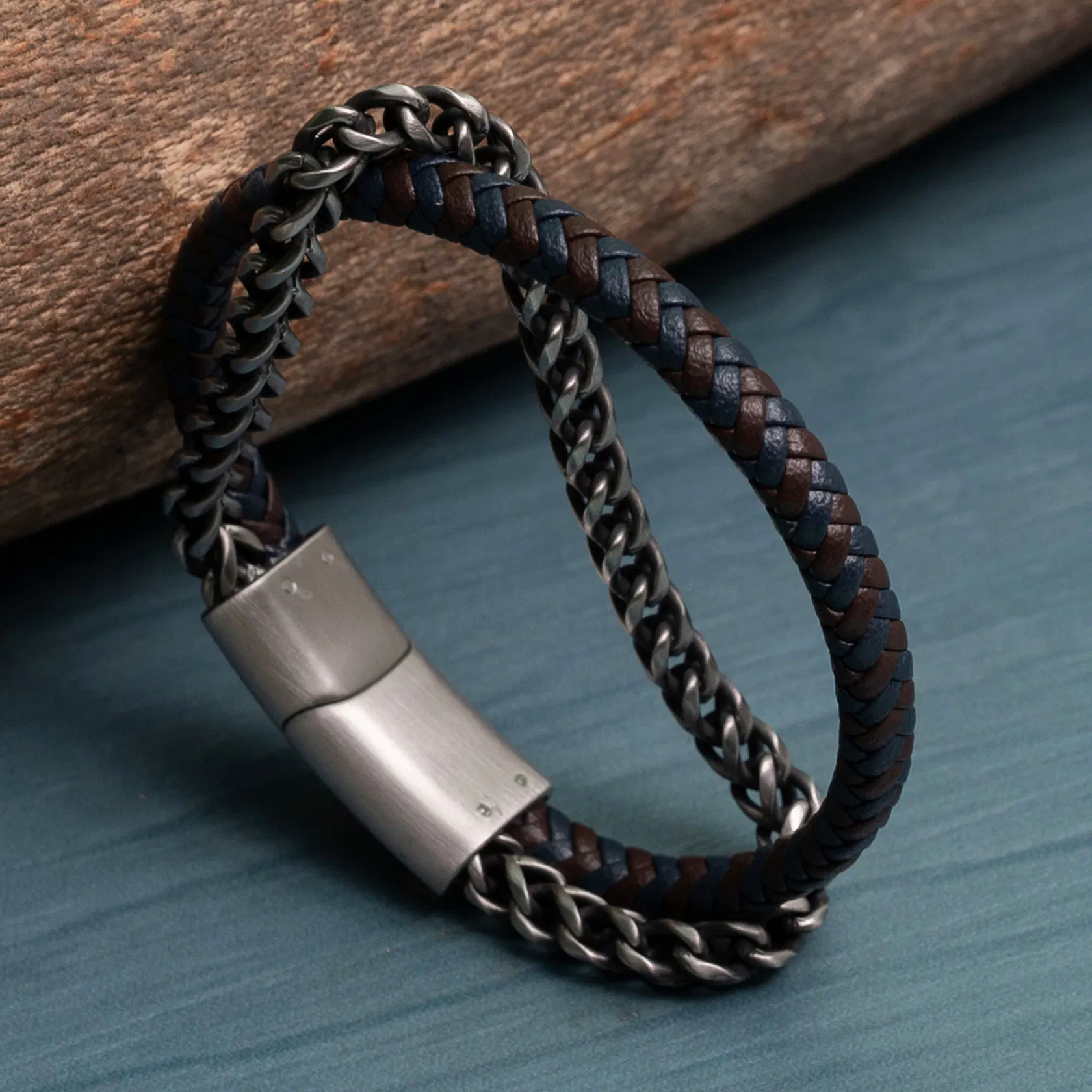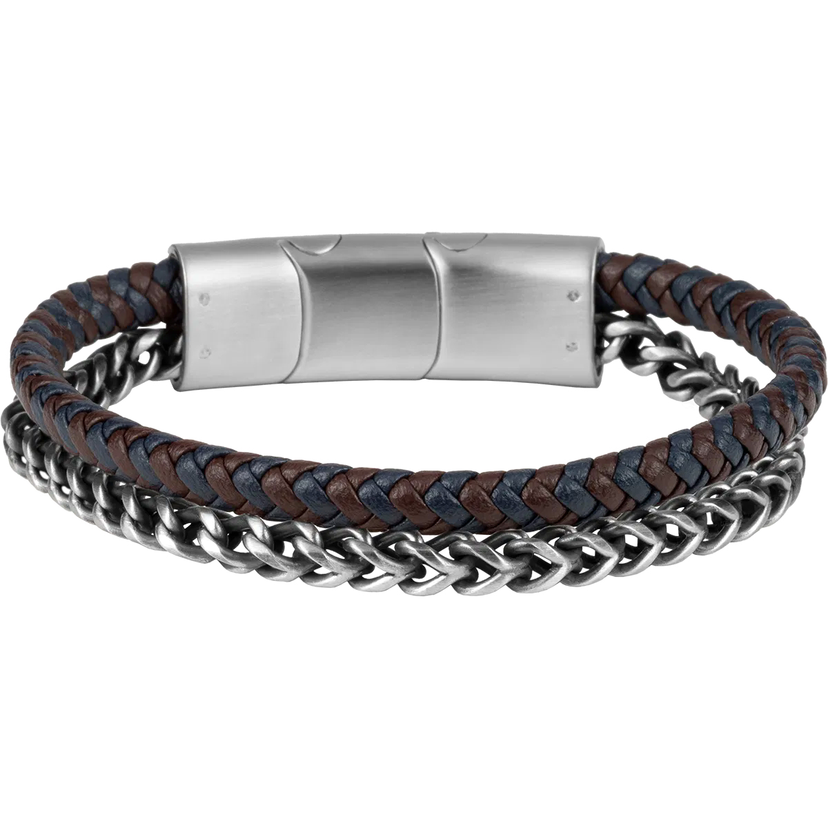 Diese Kombination aus Edelstahl- und Lederarmband fällt durch die Mischung aus moderner Kettenoptik und weichem Echtleder in braun/blau auf. Das Armband hinterlässt beim Träger einen stylische und edle Note. Der Magnetverschluss ist dazu passend in silber gehalten.