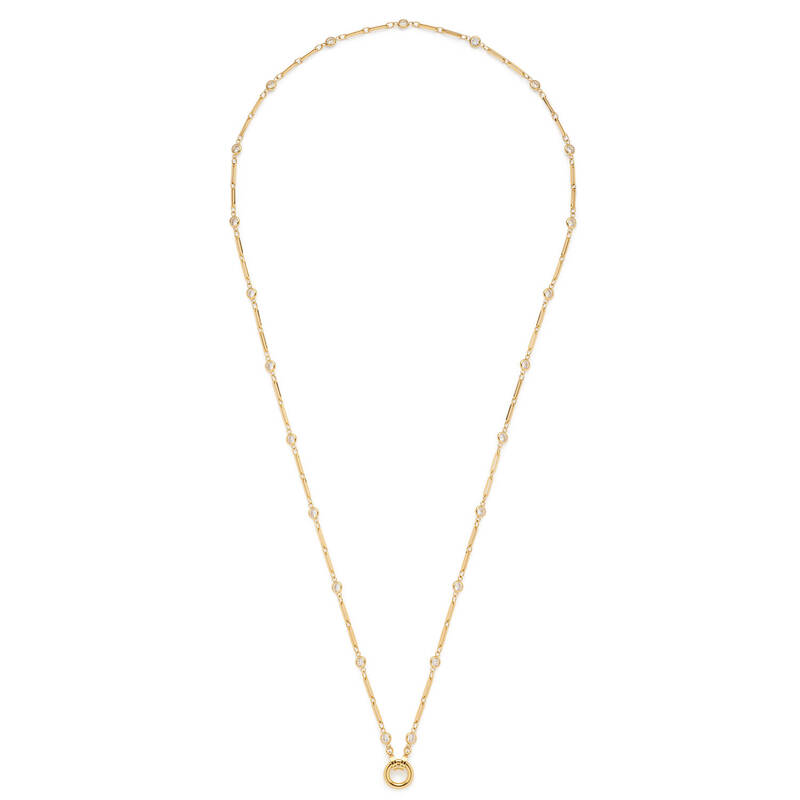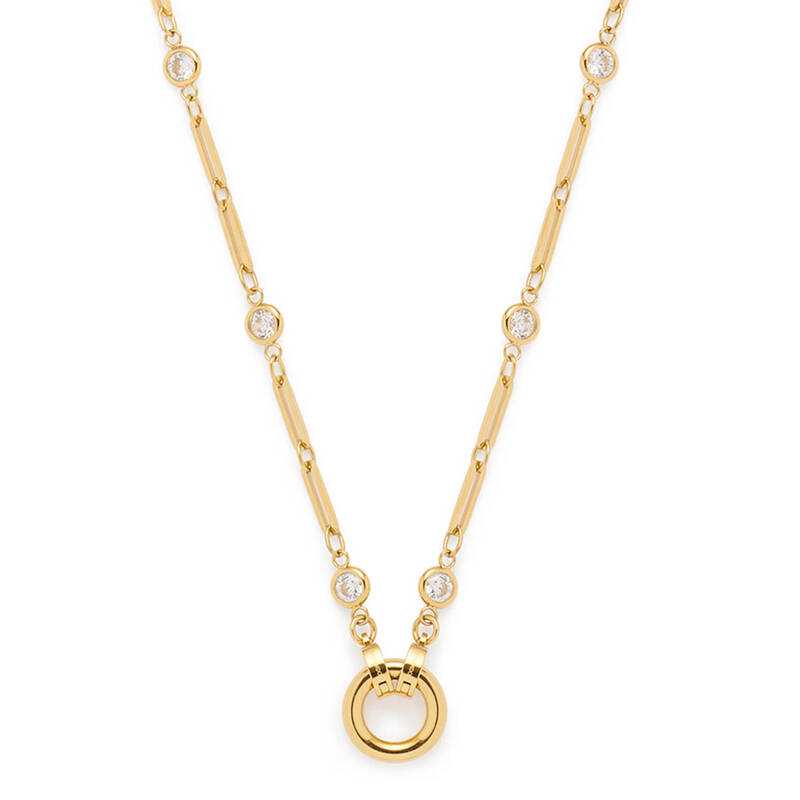 Zwischen die Glieder sind kleine, brillantgeschliffene Glassteine eingefasst, die der Kette einen feinen, funkelnden Glanz verleihen. Das Zusammenspiel aus poliertem Edelstahl und schimmerndem Glas schafft eine harmonische Balance zwischen klarer Schlichtheit und stilvoller Raffinesse.