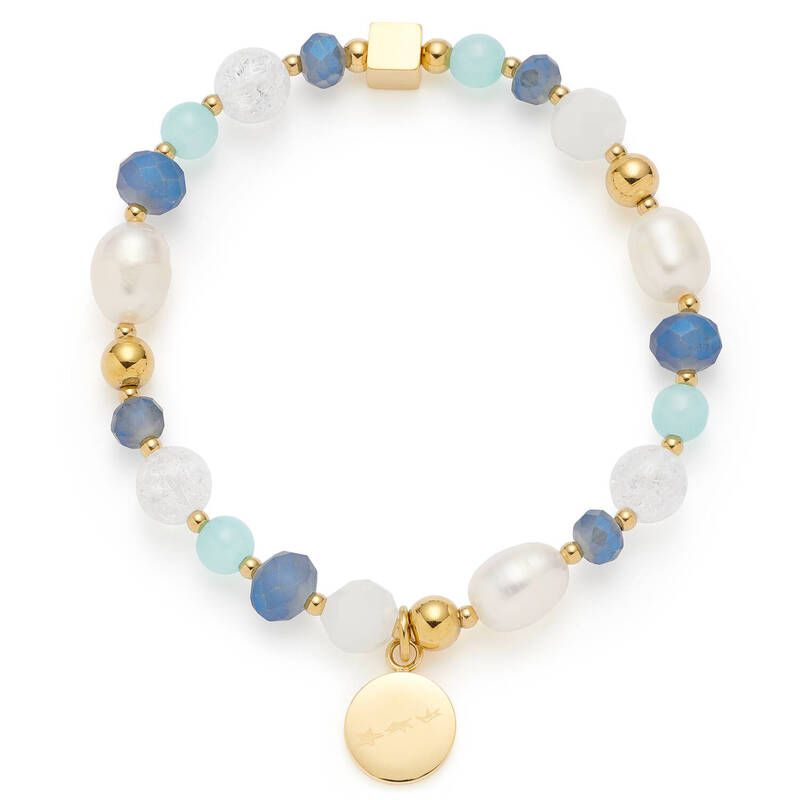 Zwischen goldglänzenden Metallkugeln, einer echten Süßwasserperle und feinen Steinkugeln aus Glas und Catseye entsteht ein harmonisches Zusammenspiel aus natürlichem Schimmer und modernem Glanz. Die sorgfältig abgestimmten Farben verleihen dem Armband eine lebendige, sommerliche Ausstrahlung.