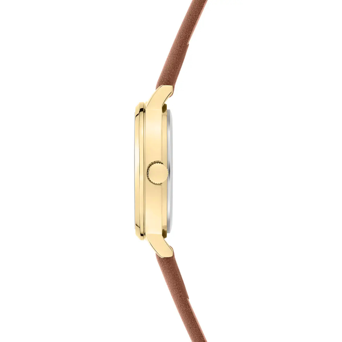 Das goldfarbene Gehäuse verleiht der Uhr eine warme, edle Note, während das braune Kunstlederband für eine klassische, harmonische Farbkomposition sorgt. Mit einem Gehäusedurchmesser von 28 mm ist sie zierlich gestaltet und besonders angenehm zu tragen – ideal für schmale Handgelenke und für Frauen, die feine Accessoires bevorzugen.