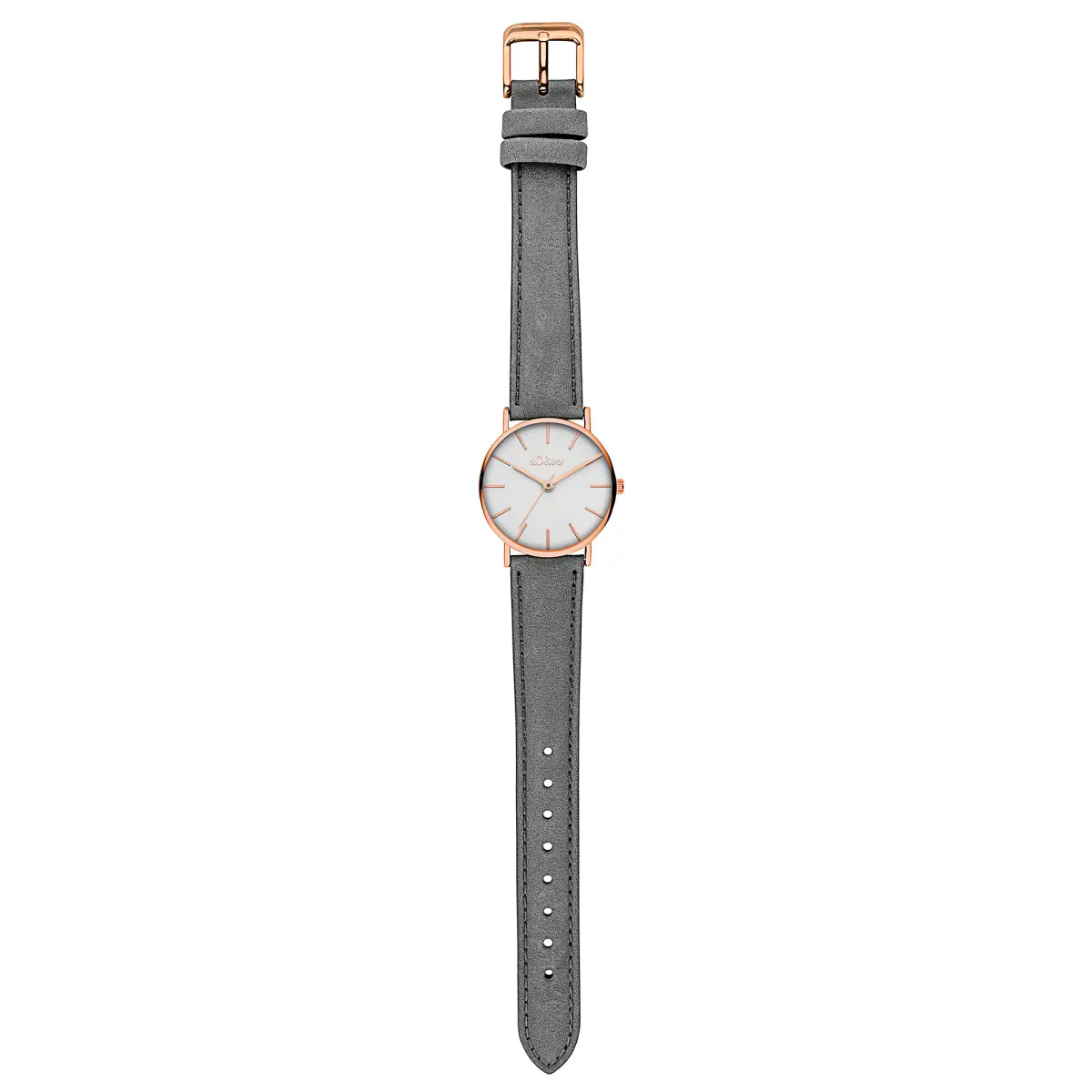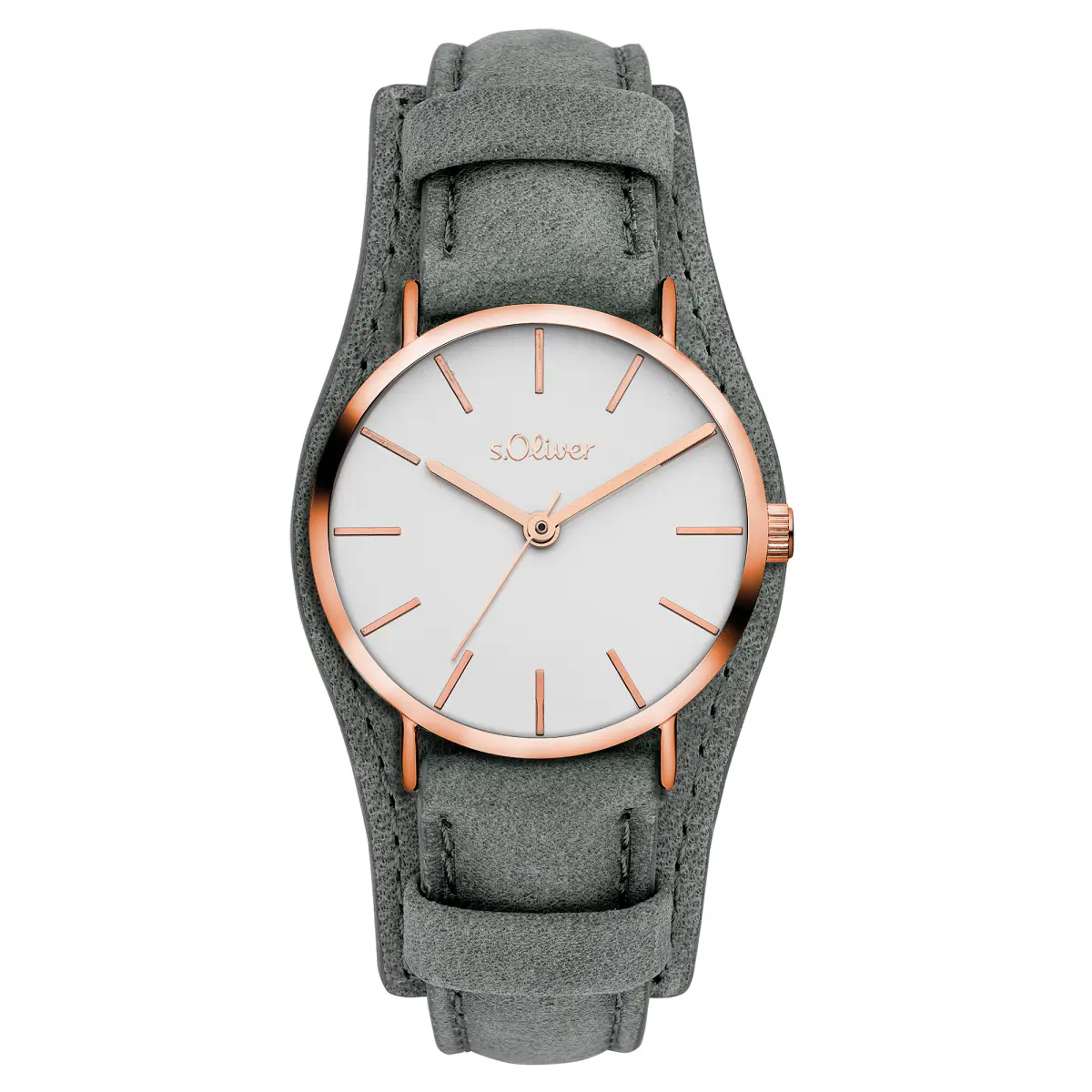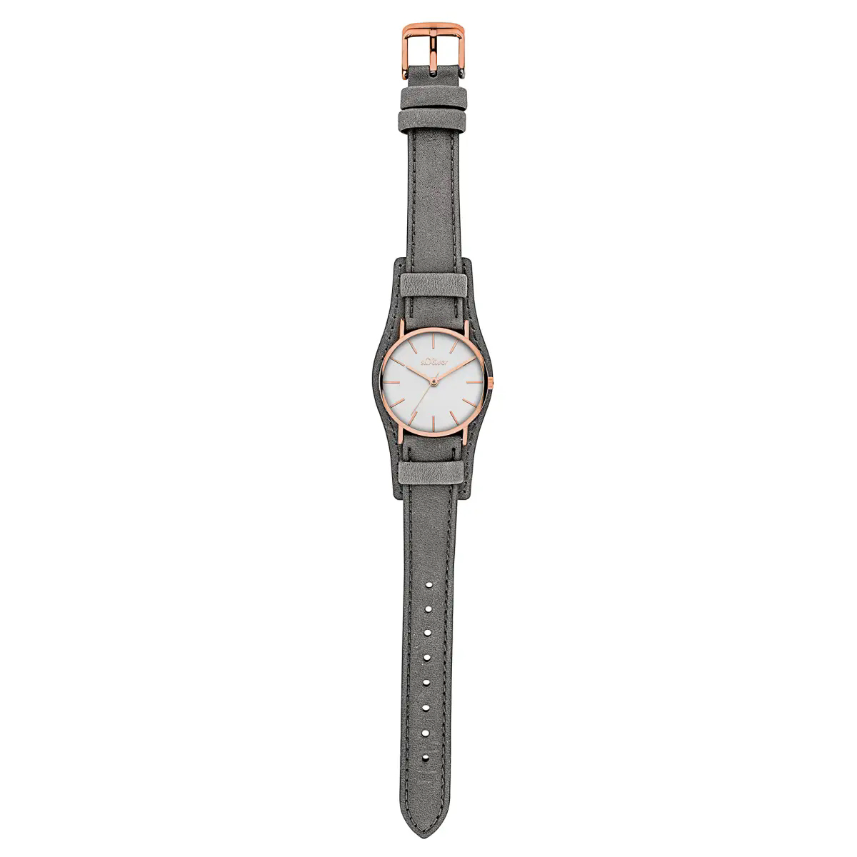 Diese elegante Damenuhr von s.Oliver vereint klassisches Design mit einem besonderen, wandelbaren Detail. Das runde roségoldfarbene Gehäuse strahlt feminine Wärme aus und harmoniert perfekt mit dem grauen Kunstlederarmband.