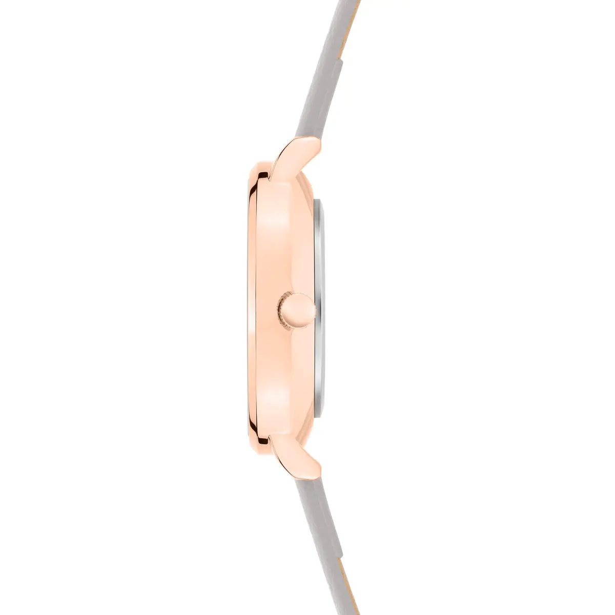 Das roségoldfarbene Gehäuse sorgt für eine warme, edle Optik, während das graue Kunstlederarmband einen harmonischen, zeitgemäßen Kontrast setzt. Mit einem Gehäusedurchmesser von 34 mm wirkt die Uhr ausgewogen am Handgelenk und bietet dank ihres leichten Designs hohen Tragekomfort.