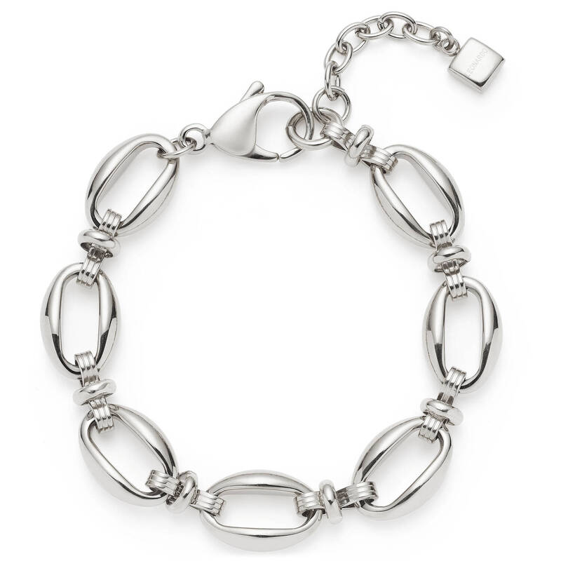 Besonders charakteristisch sind die kleinen, beweglichen Ringe auf den Zwischenstücken. Sie bringen Dynamik ins Design und erinnern mit ihrem sanften Schwung an die elegante Form eines Festons. Gefertigt aus poliertem Edelstahl, wirkt das Armband modern, klar und zugleich edel – ein Schmuckstück, das Retro-Charme auf zeitgemäße Weise neu interpretiert.