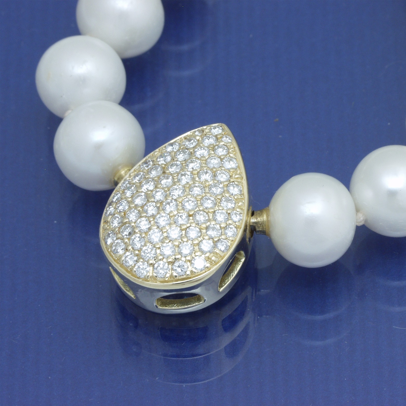 Schmuckvolle Wechselschließen bilden den perfekten Abschluss einer schönen Perlenkette. Der prachtvolle Wechselverschluss in Form eines Tropfens besteht aus hochwertigem 750er / 18 kt. Gelbgold. Funkelnde kleine Brillanten mit insgesamt 0,64 ct. TW – si bedecken vollständig die Oberfläche der edlen Schmuckschließe, die in der Breite 14 mm misst, in der Höhe 19,2 mm und 14 Gramm wiegt; die Stärke beträgt 8 mm. Mit diesem exklusiven Verschluss wird die Kette zu einem wertvollen Juwel.