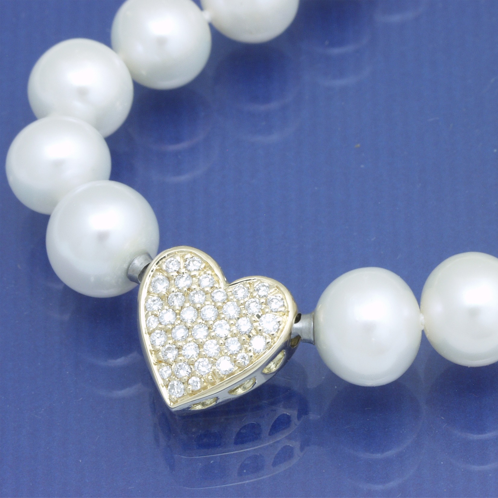 Mit einer attraktiven Wechselschließe erhält die wertvolle Perlenkette ihren krönenden Abschluss. Das ein Geschenk wie dieses von Herzen kommt, versteht sich von selbst. Der reizende Wechselverschluss besteht aus 750er / 18 kt. Gelbgold und hat die Form eines kleinen Herzens. Die Oberseite ist vollständig mit zahlreichen funkelnden Brillanten zu 0,34 ct. TW-si besetzt. Das edle Schmuckstück wiegt 5 Gramm und ist 13 mm breit und 27 mm hoch; es ist 5,2 mm stark.