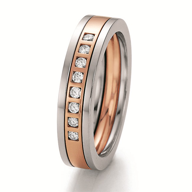 Brillantring aus 585 Rotgold mit 8 Brillanten von zusammen 0,160 ct W/Si und zwei Vorsteckrinmge aus 585 Weissgold. Breite Brillantring: 2,4 mm Breite je Vorsteckring 1,2 mm