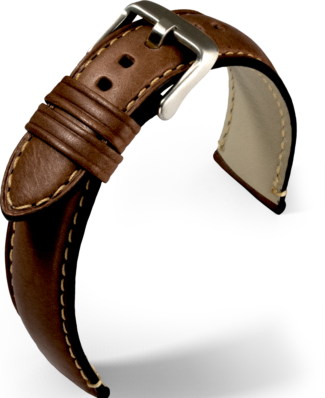 Glattes widerstandsfähiges Rinderleder mit ausgeprägter Kontrastnaht für einen sportlichen Charakter und massiver Edelstahl-Dornschließe. Ein besonders auffälliges Detail sind die schwarzen Schnittkanten, die das Band einzigartig machen.
