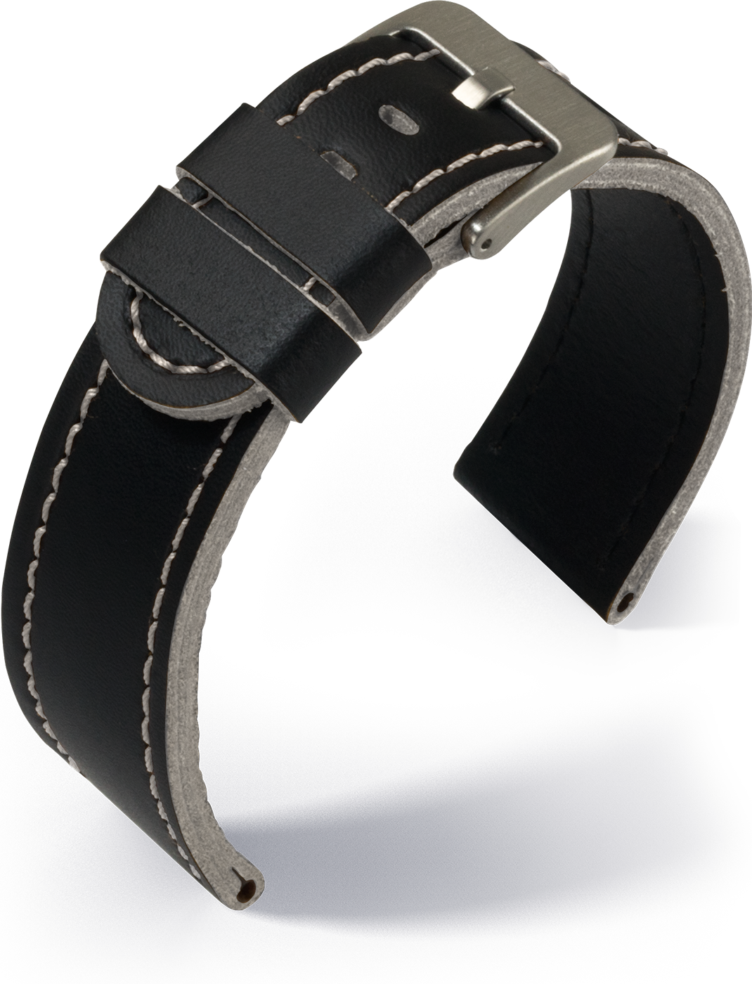 Schwarzes Schnittband aus robustem Rindleder. Wirkt durch die farbigen Kanten und Kontrastnähte sportlich und modern. Mit breiten Schnittschlaufen und mattierter Edelstahl-Dornschließe.