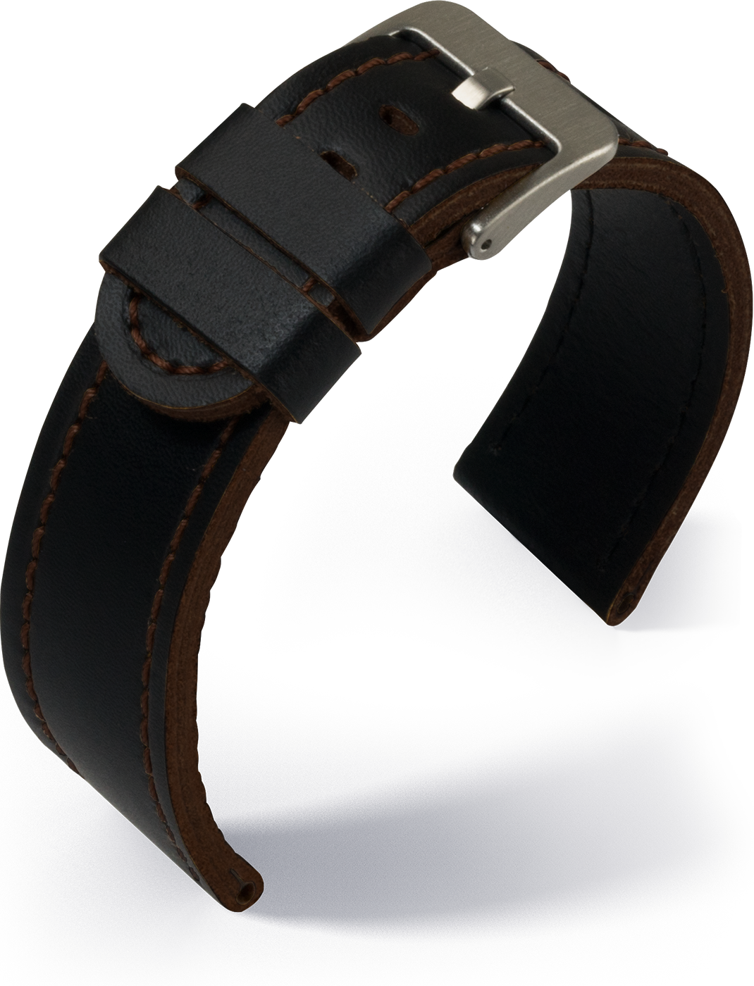 Schwarzes Schnittband aus robustem Rindleder. Wirkt durch die farbigen Kanten und Kontrastnähte sportlich und modern. Mit breiten Schnittschlaufen und mattierter Edelstahl-Dornschließe.