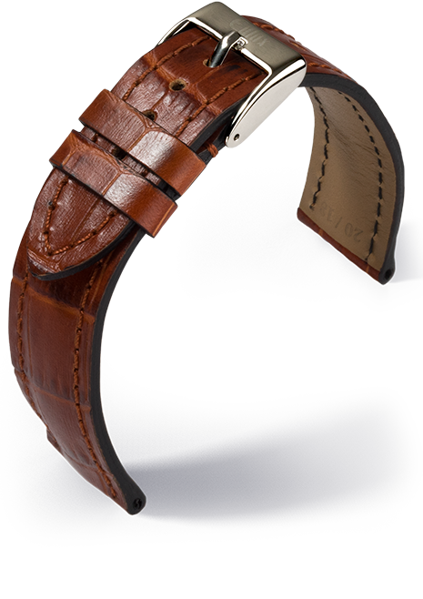 Seidenglänzendes Rindlederband mit Kroko-Prägung. Mit handpolierter und handversiegelter Schnittkante. Bombiert mit zusätzlich genähter Schlaufe, hautfreundlichem Futterleder und Edelstahl-Dornschließe. Material: Kalbsleder mit Krokoprägung